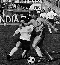 I DM gick man däremot hela vägen och spöade konkurrenten Jakobsberg i finalen. Även junior-DM vanns av Hammarby, med Älvsjö AIK som runner-up. Dessutom vann reservlaget sin serie. Över pingst gjorde fotbollsdamerna sin första resa utomlands då Västtyskland besöktes. Man deltog i en turnering i Bruchsal där lag från fem länder ställde upp. Det blev idel segrar och en målskillnad på 28-0. Laget fick ett bidrag av Hammarby på 7 000 kronor så det kostade bara 200 för varje spelare. I Västtyskland stod Ronnie Hellström och Roland Sandberg som värdar. Hammarby hade en knippe landslagsspelare: Gun Hellestig, Ingalill Arvling, Lena Isberg, Ann Jansson och Britt-Marie Karlsson. Östra Svealand750504 (Hammarby IP)Hammarby-Ronna 8-0 (3-0) Ann Jansson 2, övriga okända Om matchen: Hammarby totalt dominanta Ronnas två ”avslut” var bakåtpassningar från Bajenbackar. 750514 (Bolindervallen) Jakobsberg-Hammarby 750525 Bälinge-Hammarby 0-0 750531 (Hammarby IP) Hammarby-Väster 6-0 (4-0) 1-0 0.20 Eva-Maria Karlsson, 2-0 Eva-Maria Karlsson straff, 3-0 Ann Jansson, 4-0 Ann Jansson, 5-0 Ann Jansson, 6-0 Eva-Maria Karlsson Om matchen: Hammarby dominerade stort i den första halvleken. I andra kom Väster tillbaka och pressade på rätt bra, dock utan att vaska fram några riktiga farligheter. Bajens mål kom efter två kontringar. 750608 (Bårsta IP) Södertälje-Hammarby 0-1 (0-1) Ann Jansson 750823 Hammarby-Södertälje 2-0 750831 Väster-Hammarby 0-2 750906 Hammarby-Bälinge 750917 Hammarby-Bälinge 3-1 (1-1) Hammarby: Susanne Haglund, Christina Persson, Gunilla Karlsson Bälinge: Marja Norberg 750921 Ronna-Hammarby 0-0 750927 Norrköping-Hammarby 2-5 Norrköping: Karin Ohlsson, Marianne Svensson Hammarby: Britt-Marie Karlsson 3, Ann Jansson, Lena Isberg 751001 (Hammarby IP) Hammarby-Norrköping 4-0 (2-0) Ann Jansson 2, Pia Ewald, Kristina Leino 751005 Hammarby-Lotorp 3-0 (0-0) Ann Jansson, Britt-Marie Karlsson, Eva-Maria Karlsson 751011 (Hammarby IP) Hammarby-Jakobsberg 1-0 (0-0) 1-0 53 Lena Isberg (Britt-Marie Karlsson) Om matchen: Hammarby tog hem såväl serie som DM i och med segern. Laget vann rättvist i en nervös match. SM750803 (1 omg)Gideonsbergs IF-Hammarby 0-1 Britt-Marie Karlsson 750822 (2 omg, Årsta IP) Hammarby-Hemse BK 3-0 750830 (kvartsfinal) Öxabäcks IF-Hammarby 1-0 (1-0) 1-0 20 Ann-Christine Lindkvist Publik: 650 DM740413 (1 omg)Hammarby-Rönninge SK 15-0 Ann Jansson 9, Eva-Maria Karlsson 2, Maria Wiman 2, Gunilla Karlsson, Britt-Marie Karlsson Hammarby-Vendelsö IK wo (2 omg) Hammarby-Ekopojkarna 5-0 (kvartsfinal) 750611 (semifinal) Hammarby-AIK 4-0 (4-0) Om matchen: Klasskillnad. AIK hade inte en enda målchans. 751011 (final, Hammarby IP) Hammarby-Jakobsbergs GoIF 1-0 (0-0) 1-0 53 Lena Isberg (Britt-Marie Karlsson) Matchen gällde även som seriematch och betydde att Hammarby vann serien. Träningsmatcher750509 (Jakobsbergscupen, gruppspel)Hammarby-IFK Helsingfors 7-0 Ann Jansson 4, Susanne Haglund, Jeanette Berg, Helena Larsson Om matchen: Hammarby saknade sex spelare men kunde ändå köra över det finska laget. 750510 (Jakobsbergscupen, gruppspel) Hammarby-IFK Malmö 3-0 Britt-Marie Karlsson 2, Kristina Leino 750510 (Jakobsbergscupen, gruppspel) Hammarby-Öxabäcks IF 0-0 750511 (Jakobsbergscupen, match om 3:e pris) Jakobsbergs GoIF-Hammarby 2-1 (2-0) Jakobsberg: Birgitta Söderström, Inga-Lena Berg Hammarby: Helena Larsen 750517-19 (i Bruchsal, Västtyskland) Hammarby-AVS Freudenheim 3-0 (gruppspel) Hammarby-SV Obrigheim 9-0 Hammarby-SV Armania Hannover 2-0 (semifinalspel) Hammarby-SC Wertheim 5-0 Hammarby-Untergrobach FS 0-0 Hammarby-DFC Ostbahn, Wien 4-0 (semifinal) Hammarby-Bruchsal 4-0 P: 2 500 (final) Hammarbys målskyttar: Ann Jansson 10, Eva-Maria Karlsson 8, Pia Ewald 3, Lena Isberg 2, Isa Löfstedt, Maria Wiman, Susanne Haglund, Gunilla Karlsson, Britt-Marie Kalsson 750810 Södertälje-Hammarby 0-1 (Kringlan Cup) 750810 (final, Kringlan Cup) Hammarby-Jakobsberg 5-0 (3-0) Ann Jansson 3, Eva-Maria Karlsson, Britt-Marie Karlsson Trångsunds IF:s skinkcup, 751209Finnströmskamraterna, Åland-Hammarby 2-5Hammarby-Jakobsberg 4-0 (final) SpelartruppenMålvakter:26. Gun Hellestig, 20 år 1. Agneta Åkesson, 17 år Försvarare: 11. Boel Fahlström, 24 år 22. Susanne Haglund, 17 år 5. Lena Isberg, 15 år 2. Barbro Jämtmark, 39 år 12. Riita Kaikonen, 18 år 14. Eva-Maria Karlsson, 18 år (Lycksele IF) 13. Kristina Leino, 18 år (Bro IK) 6. Kristina Westin, 26 år Mittfältare: 21. Jeanette Bergh, 14 år (IF Cobran) 23. Marianne Crona, 22 år 8. Pia Ewald, 18 år 24. Ann-Charlotte Johansson, 20 år 19. Britt-Marie Karlsson, 22 år (IK Göta) 7. Gunilla Karlsson, 31 år 20. Helena Larsen, 16 år (Viggbyholm IK) 9. Agneta Norman, 18 år 15. Christina Persson, 22 år (IFK Rättvik) Anfallare: 3. Inga-Lill Arvling, 19 år 10. Ann Jansson, 17 år 4. Birgitta Johansson, 19 år 17. Isa Löfstedt, 17 år 25. Lena Similä, 16 år 18. Ann Ström, 20 år 16. Maria Wiman, 20 år Övriga: Ulla Nord, 23 år Susanna Rosen Helena Schöldsten Lena Söderström Tränare och lagledare: Christer Molander ÖvrigtJunior-DMHammarby-Älvsjö AIK 1-0FriidrottUnder året kom 55 aktiva över från Hellas till Hammarby. Skälet var att man tyckte att Hammarbys ideologi, där alla fick vara med och ingen skulle drabbas för att man inte hade råd med utrustning mm, var lockande. Hellas hade uppenbarligen ett annat sätt att se på saker. Därmed förstärktes Hammarbys friidrott och det skulle märkas i resultatlistorna åren framöver. I SM kom längdhopparen Roand Fröderberg på 8:e plats i längd efter ett hopp på 6,89. Tidigare på sommaren hade han klarat 7,14, vilket skulle ha betytt en bra placering i SM. Junioren Lisa Lundin kom tvåa i B-SM i höjd på 1,60. Hon kom även tvåa i spjut. I spjut vann hon junior-DM. Fem Hammarbyungdomar kvalade in till UP (ungdomspropaganda)-finalerna i Östersund, en tävling för landets bästa. De fem var Carola Jönsson, 300 