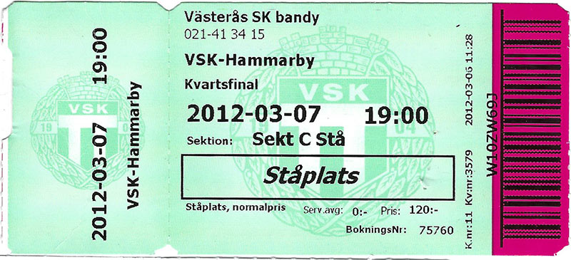 Laget besegrade Västerås i en rafflande och svängande kvartsfinal. Hammarby tog ledningen med 1-0, Västerås vände till 1-2 och Hammarby vände tillbaka till 3-2 i matcher. Sandviken i semifinalen blev dock för svåra. Hammarbys chans låg i att vinna den första matchen. I stället gick segern, inte helt rättvisande, till Sandviken i sudden death. SAIK vann sedan ytterligare två raka matcher övertygande. Hammarbys landslagsrepresentation bestod av, A-laget: Olov Englund, Carl-Johan Rutqvist, Robin Sundin, Stefan Erixon och Patrik Nilsson, U23-laget: Robert Rimgård, U19-laget: August Elebring, P17: Kasper Milerud. Dessutom spelade Alex Adeheimer för det finska P17-landslaget. Stefan Erixon och Olov Englund var med i det lag som vann VM i Kazakstan. Sverige besegrade Ryssland i Almaty med 5-4. Även Kasper Milerud vann en mästerskapstitel, öppna Nordiska Mästerskapen med det svenska P17-landslaget efter 3-2 mot Ryssland i Finalen i finska Varkaus. Svensk bandy instiftade under året ”Bandyns Hall of fame” med 11 spelare som förärades ett fame-status. Som nummer 11 kom den gamla Hammarbyspelaren (om än från Vetlanda) Jonas Claesson. Elitserien111028Vänersborg-Hammarby 6-6 (2-3) Vänersborg: Marcus Sixtensson Ottosson 2, Robin Lundqvist, Christofer Fagerström, Henric Eriksson, Viktor Weiselius Hammarby: Patrik Nilsson 3, Stefan Erixon 2, Rickard Koch Domare: Jonas Kandell/Thomas Hofling, Tobias Lindberg, Per Jakobsson Publik: 2 342 111102 (Zinkensdamm) Hammarby-Villa Lidköping 6-3 (2-0) Hammarby: Stefan Erixon 2, Patrik Nilsson 2, Johan Östblom, Klas Nordström Villa: David Karlsson 2, Martin Johansson Domare: Håkan Sjösten/Lars Engström, Pontus Petersson, Daniel Käck Publik: 4 030 111108 (Zinkensdamm) Hammarby-Sandviken 2-7 (1-1) Hammarby: David Pizzoni Elving, Klas Nordström Sandviken: Daniel Berlin 3, Johan Löfstedt 2, Mikael Nilsson, Erik Pettersson Domare: Mikael Karlsson/Pontus Petersson, Kenneth Kristiansson, Håkan Birgersson Publik: 2 402 111111 (Zinkensdamm) Hammarby-Västerås 5-4 (1-3) Hammarby: Stefan Erixon 2, Rickard Koch 2, Ulf Einarsson Västerås: Pekka Rintala 2, Jonas Nilsson, Oscar Gröhn Domare: Mikael Karlsson/Daniel Labe, Carl-Johan Vilsson, Kent Lisell Publik: 2 444 111116 Edsbyn-Hammarby 7-0 (4-0) Fredrik Åström, Simon Jansson, Daniel Liw, Martin Frid, Magnus Olsson, Mattias Hammarström, Jonas Edling Domare: Peter Öhrlund/Henrik Johansson, Boiwe Gustafsson, Lars Engström Publik: 1 319 111118 (Zinkensdamm) Hammarby-Kalix 6-2 (3-2) Hammarby: Stefan Erixon 2, Rickard Koch 2, Klas Nordström, Willy Johansson Kalix: Simon Wiklund, Jimmy Berglund Domare: Thomas Nordin/Lars Engström, Hasse Hellgren, Patrik Widmark Publik: 1 795 111123 Broberg-Hammarby 6-3 (3-2) Broberg: Adam Gilljam 2, Ted Bergström, Erik Jonsson, Jonas Nygren, Joakim Hedqvist Hammarby: Stefan Erixon 2, Johan Östblom Domare: Mikael Karlsson/Håkan Birgersson, Christoffer Johansson, Tomas Behlander Publik: 714 111202 (Zinkensdamm) Hammarby-Vetlanda 8-2 (6-1) Hammarby: Stefan Erixon 3, Klas Nodström 2, Rickard Koch 2, Per Einarsson Vetlanda: Joakim Andersson, Anatoly Suzdalev Domare: Jonas Kandell/Thomas Ljung, Jonas Jonsson, Ola Wållringer Publik: 2 445 111206 Bollnäs-Hammarby 4-4 (2-3) Bollnäs: Andreas Westh, Markus Ståhl, Juho Liukkonen, Ville Aaltonen Hammarby: Ulf Einarsson, Stefan Erixon, Klas Nordström, Rickard Koch Domare: Ulrik Bergman/Robert Andersson, Daniel Labe, Tomas Behlander Publik: 1 545 111209 (Zinkensdamm) Hammarby-Tillberga 4-1 (2-1) Hammarby: Stefan Erixon, David Pizzoni Elfving, Klas Nordström, Rickard Koch Tillberga: Jonas Lindqvist Domare: Ronny Andersson, Kalix/Kenneth Kristiansson, Sundbyberg, Fredrik Johansson, Hässelby, Håkan Birgerson, Hägersten Publik: 1 326 111214 GAIS-Hammarby 2-2 (1-1) GAIS: Magnus Muhrén, Erik Claesson Hammarby: Johan Östblom, Rickard Koch Domare: Max Johansson/Patrik Johansson, Thomas Hofling, Kim Jensen Publik: 765 111216 Kungälv-Hammarby 5-3 (1-1) Kungälv: Mikko Rytkönen 2, Ted Skoglund, Mattias Johansson, Fredrik Brandin Hammarby: Per Einarsson, Stefan Erixon, Klas Nordström Domare: Max Johansson/Boiwe Gustavsson, Johan Tedbrandt, Mattias Öhrn Publik: 756 111226 (Zinkensdamm) Hammarby-Sirius 5-5 (3-4) Hammarby: Stefan Erixon 2, Robin Sundin 2, Jesper Eriksson Sirius: Christian Mickelsson 2, Viktor Broberg, Lars Fall, Karl Spjuth Domare: Peter Öhrlund/Patrik Jonsson, Christoffer Johansson, Patrik Widmark Publik: 6 237 111230 Tillberga-Hammarby 2-7 (1-5) Tillberga: Mattias Rydberg, Johan Andersson Hammarby: Rickard Koch 2, Johan Östblom, Stefan Erixon, David Pizzoni Elfving, Robin Sundin, Klas Nordström Domare: Anders Kristiansson/Robert Andersson, Mattias Öhrn, Jonas Jonsson Publik: 341 120103 (Zinkensdamm) Hammarby-Kungälv 4-4 (2-1) Hammarby: Johan Östblom, Stefan Erixon, Klas Nordström, Jesper Eriksson Kungälv: Mikael Lindberg 2, Markus Kumpuoja, Antti Ekman Domare: Jonas Kandell/Jimmy Elwing, Pontus Petersson, Peter Hampus Publik: 2 088 120106 Sirius-Hammarby 4-4 (1-2) Sirius: Viktor Broberg 2, Andreas Werner, Christian Mickelsson Hammarby: Ulf Einarsson, Stefan Erixon, David Pizzoni Elfving, Patrik Nilsson Domare: Håkan Sjösten/Lars Engström, Fredrik Johansson, Ola Wållringer Publik: 2 725 120111 Vetlanda-Hammarby 2-5 (0-2) Vetlanda: Anatoly Suzdalev, Andreas Lysell Hammarby: Patrik Nilsson 3, Stefan Erixon, Klas Nordström Domare: Anders Kristiansson/Daniel Labe, Carl-Johan Vilson, Örjan Bruce Publik: 1 483 120113 (Zinkensdamm) Hammarby-Bollnäs 4-3 (2-2) Hammarby: Patrik Nilsson 2, Stefan Erixon, Jesper Eriksson Bollnäs: Per Hellmyrs, Anders Spinnars, Juho Liukkonen Domare: Jonas Kandell/Patrik Jonsson, Thomas Persson, Kent Lisell Publik: 3 659 120118 (Zinkensdamm) Hammarby-Broberg 4-4 (2-1) Hammarby: Patrik Nilsson 2, Johan Östblom, Stefan Erixon Broberg: Stefan Larsson 2, Ted Bergström, Adam Gilljam Domare: Andrey Tokmarov/Igor Savenkov, Grigoriy Minaev, Peter Hampus Publik: