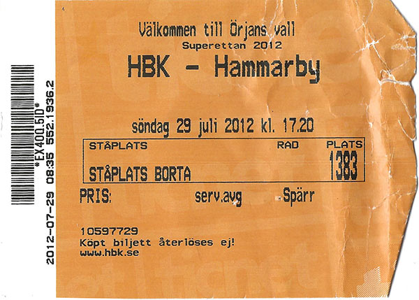 Detta trots kloka värvningar och en kanonstart med fem vunna och en oavgjord de första sex omgångarna. Backlinjen hade förstärkts med hemvändande Max von Schlebrügge och den trygge Geflespelaren Daniel Theorin. Mittfältet såg en annan hemvändare, Mikael Rynell, närmast från Danmark, energiske superbajaren Christophe Lallet från Degerfors och bollvinnaren Adis ”Baggio” Husidic från Chicago. Men, mittbacksparet fick bara några minuter tillsammans. När von Schlebrügge äntligen kom tillbaka från en allvarlig försäsongshjärnskakning så gick Theorin sönder. Och det enda anfallsförvärvet, talangfulle amerikanen William ”Billy” Schuler, kunde inte ta över taktpinnen när Sinan Ayranci sviktade. Så när motgångarna kom för laget, så tappade man kollektivt självförtroendet totalt, liksom de tre föregående säsongerna. Under de närmaste elva omgångarna spelades endast sju poäng in, och chansen till uppflyttning i praktiken redan 29 juli genom förlusten borta mot Halmstad (även om den definitiva spiken kom mot BP i omgång 23 i mitten av september). Till skillnad från de tidigare åren i Superettan (fr a 2009 och 2010) så hade laget ett spel att falla tillbaka på. Så när det började rulla in sommarförvärv; backarna Billy Berntsson och dansken Thomas Guldborg Christensen, den kanadensiske landslagsmittfältaren Nik Ledgerwood, följt av anfallarna Mattias Adelstam från Trelleborg och Erik Sundin, toppat av gamla Kennedy, ja då började laget sakta komma igång. De sista 13 omgångarna vann laget 7 matcher och spelade 5 oavgjort. Till slut hade Hammarby ett lag som inte bara skulle kunna ta steget upp utan även kunna hävda sig någorlunda i allsvenskan. Visserligen var truppen på höstkanten stor som en mindre invasionsarmé, men det kunde alltid avhjälpas med en välbehövlig utrensning. Den planerade flytten till den nya arenan, under året döpt till Tele2 Arena, blev inte av då byggbolaget inte lyckades bygga klart i tid. Skadeståndet som Hammarby fick, åtskilliga miljoner, hjälpte dock antagligen till att finansiera ett och annat av nyförvärven under sommaren. Hammarbys insats i Svenska cupen blev en pinsam historia där laget åkte ut på straffar mot Sirius i Uppsala. Hammarbys ungdomsfotboll slog dock deltagarrekord. Föreningen hade hela 1 204 aktiva i 124 lag, plus 431 knattespelare. Superettan120409 (Söderstadion)Hammarby-Halmstad 1-0 (1-0) Program Lagbild Tifo 1-0 21 Sebastian Bojassén (Mikael Rynell) Hörnor: 5-4 Varningar, Hammarby: Christophe Lallet, Sinan Ayranci Halmstad: Ryan Paul Miller, Johan Blomberg, Christian Järdler Domare: Kristoffer Karlsson, Helsingborg/Andreas Björkman, Insjön, Patrik Klintberg, Visby, Johan Hamlin, Bro Publik: 11 959 120416 (T3 Arena) Umeå-Hammarby 1-2 (1-0) 1-0 22 Danny Persson (Johan Larsson), 1-1 53 Adis Husidic, 1-2 70 Sebastian Castro-Tello (Billy Schuler) Hörnor: 7-7 Varningar, Umeå: Mohamed Kamanor Hammarby: Johannes Hopf Domare: Jim Petersson, Motala/Albert Andersson, Borensberg, Conny Hugman, Luleå, Isak Classon, Skellefteå Publik: 7 045 120423 (Söderstadion) Hammarby-Brommapojkarna 3-1 (2-1) Program Lagbild 1-0 17 självmål, 2-0 25 Christophe Lallet (Mikael Rynell), 2-1 36 Pablo Piñones-Arce (serge-Junior Martinsson Ngouali, 3-1 68 Sebastian Bojassén Hörnor: 7-6 Varningar, Hammarby: Marcus Törnstrand, José Monteiro De Macedo BP: Joakim Lindner, Pontus Segerström Domare: Antti Kanerva, Olofstorp/Magnus Moberg, Bromma, Daniel Ekman, Göteborg, Johan Kjellin, Sundbyberg Publik: 9 851 120427 (Domnarvsvallen) Brage-Hammarby 0-2 (0-1) Biljett 0-1 37 Sebastian Castro-Tello (Erik Figueroa), 0-2 51 Christophe Lallet (Andreas Dahl) Hörnor: 8-3 Varningar, Brage: Prince Eboagwu, Adam Gradén Hammarby: Andreas Dahl Domare: Magnus Ahlsén, Linköping/Christian Andersson och Mark Josef, Norrköping, Patrik Larsson, Borlänge Publik: 6 500 120506 (Söderstadion) Hammarby-Varberg 1-1 (0-1) Lagbild Program Tifo 0-1 4 Gabriel Altemark (Jonatan Berg), 1-1 74 Sebastian Castro-Tello (Sinan Ayranci) Hörnor: 7-3 Utv, Varberg: Thommie Persson (2 gula) Varningar, Hammarby: Billy Berntsson, Adis Husidic, José Monteiro De Macedo Varberg: Alexander Mellqvist Domare: Lars Olsson, Umeå/Patrik Klintberg, Visby, Mahbod Beigi, Sandviken, Linn Andersson, Stockholm Publik: 11 113 120513 (Finnvedsvallen) Värnamo-Hammarby 0-1 (0-1) 0-1 28 Christophe Lallet (Erik Figueroa) Hörnor: 2-4 Varningar, Värnamo: Elmin Kurbegovic, Carlos Gaete Moggia, Vladica Zlojutro Hammarby: Marcus Törnstrand, Sebastian Castro-Tello, Erik Figueroa Domare: Mohammed Al-Hakim, Västerås/Magnus Vallerius, Falkenberg, Anders Böwing, Jönköping, Levente Szasz, Ljungby Publik: 3 110 120518 (Söderstadion) Hammarby-Assyriska 0-2 (0-2) Program Lagbild 0-1 23 Fuad Hyseni (Nahir Besara), 0-2 38 Sotirios Papagiannopoulos (Stefan Batan) Hörnor: 4-6 Varningar, Hammarby: Erik Figueroa Assyriska: David Azin Domare: Bojan Pandzic, Hisings Backa/Magnus Moberg, Bromma, Joakim Amri Nilsson, Hisings Backa, Per Melin, Solna Publik: 11 550 120522 (Landskrona IP) Landskrona-Hammarby 4-1 (2-1) 1-0 9 Thomas Raun (Fredrik Karlsson), 1-1 11 Andreas Dahl, 2-1 28 Fredrik Karlsson (Fredrik Olsson), 3-1 65 Fredrik Olsson, 4-1 85 Fredrik Olsson Hörnor: 3-8 Varningar, Landskrona: Philip Andersson Hammarby: Sinan Ayranci Domare: Jim Petersson, Motala/Andreas Grönman, Borås, Jonas Andersson och Nabil Fakhro, Malmö Publik: 3 450 120528 (Söderstadion) Hammarby-Falkenberg 2-2 (1-0) Lagbild Program Tifo 1-0 16 Christophe Lallet (Andreas Dahl), 1-1 52 Victor Sköld (Anton Wede), 2-1 53 Billy Schuler, 2-2 81 Zlatan Krizanovic (Christoffer Carlsson) Hörnor: 8-5 Varningar, Hammarby: Erik Figueroa, Max Forsberg Falkenberg: Stefan Rodevåg Domare: Magnus Ahlsén, Linköping/Christian Andersson, Norrköping, Pagtrik Klintberg, Visby, Jonas Bäcklund, Solna Publik: 7 889 Om matchen: Ur matchprogrammet 2016 120601 (Ängelholms IP) Ängelholm-Hammarby 1-