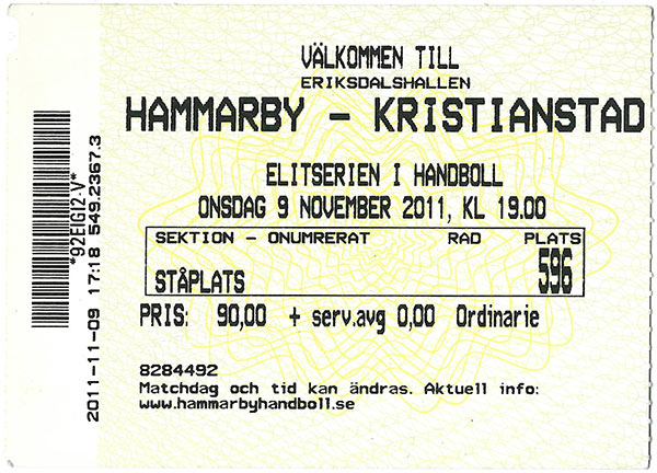 Martin Dolk utsågs av supportrarna till Årets spelare i en omröstning. Hanbollen hade stora ekonomiska problem. Det löstes, åtminstone tillfälligt, genom en kampanj av årskortsförsäljning som drog in över en miljon på bara tre dagar. Andreas Halvarsson representerade U17-landslaget och Josef Pujol spelade i U21-landslaget under säsongen. Elitserien110914 Sävehof-Hammarby 28-22110923 Hammarby-Caperiotumba 23-23 110926 Redbergslid-Hammarby 35-31 111001 Hammarby-Skövde 28-25 111005 Eskilstuna Guif-Hammarby 37-25 111014 Hammarby-Alingsås 25-20 Biljett 111019 Lugi-Hammarby 37-27 111026 Hammarby-H43 21-24 Program 111030 Caperiotumba-Hammarby 23-23 111109 Hammarby-Kristianstad 27-32 Biljett 111114 Redbergslid-Hammarby 35-23 111116 Hammarby-Malmö 27-28 111128 Skövde-Hammarby 27-30 111130 Hammarby-Drott 24-26 111207 Eskilstuna Guif-Hammarby 29-27 111210 Hammarby-Aranäs 25-22 111214 Alingsås-Hammarby 33-18 111218 Hammarby-Ystad 31-36 Program 111222 Hammarby-Sävehof 25-30 111226 Sävehof-Hammarby 27-25 111230 Ystad-Hammarby 37-18 120201 Hammarby-Alingsås 22-24 Biljett 120205 Aranäs-Hammarby 23-20 120208 Hammarby-Eskilstuna Guif 25-33 Biljett 120219 Drott-Hammarby 27-30 120226 Hammarby-Skövde 22-26 120226 Hammarby-Skövde 22-26 120229 Malmö-Hammarby 24-20 120303 Hammarby-Redbergslid 27-28 Biljett 120306 Kristianstad-Hammarby 32-28 120311 Hammarby-Caperiotumba 21-23 Biljett 120314 H43-Hammarby 23-38 120321 Hammarby-Lugi 24-28 Kval till Elitserien120328 OV Helsingborg-Hammarby 28-24 P: 413 (Idrottens Hus, Helsingborg)120401 Hammarby-VästeråsIrsta 22-24 Biljett P: 727 (Eriksdalshallen) 120410 Lindesberg-Hammarby 25-25 P: 1 231 (Lindesberg Arena) 120415 Hammarby-Aranäs 28-34 P: 548 (Eriksdalshallen) 120418 H43-Hammarby 27-28 (Fofsparbanken Arena) 120421 Hammarby-H43 32-24 P: 612 (Eriksdalshallen) 120425 Aranäs-Hammarby 28-23 P: 521 (Aranäshallen Kungsbacka) 120430 Hammarby-Lindesberg 27-26 P: 387 (Eriksdalshallen) Program 120503 VästeråsIrsta-Hammarby 23-31 P: 639 (Bombardier Arena) 120506 Hammarby-Helsingborg 32-25 P: 2 397 (Eriksdalshallen) TräningsmatcherÅhus Beach Handboll Festival 110722-23Redbergslids IK-Hammarby 7-13 Hammarby-SG Flensburg Handewitt 1 12-13 Hammarby-H 43 14-8 IFK Kristianstad-Hammarby 13-6 Hammarby-Rimbo HK 10-13 SG Flensburg Handewitt 2-Hammarby 11-7 SG Flensburg Handewitt 2-Hammarby 14-8 (kvartsfinal) 110820-21 VästeråsIrsta-Hammarby 20-26 (13-10) Hammarby: Martin Dolk 7, Adam Johansson 7, Thröstur Thrainsson 5, Jonathan Wenell 2, Nils Pettersson, Gunnar Pettersson, Rasmus Båverud, Johan Nilsson, Anders Wiik Rydberg 110826 Fyllingen, Norge-Hammarby 29-28 (Bergslagens Sparbanks Cup) 110827 HK Malmö-Hammarby 31-26 (Bergslagens Sparbanks Cup) 110828 LIF Lindesberg-Hammarby 23-25 (Bergslagens Sparbanks Cup) 110902-4 Hammarby-Tyresö IF 32-25 (Skånelas försäsongsturnering) 110902-4 Hammarby-HC West, Finland 31-29 (Skånelas försäsongsturnering) 110902-4 Skånela IF-Hammarby 29-27 (Skånelas försäsongsturnering) 110902-4 Hammarby-VästeråsIrsta 25-23 (Skånelas försäsongsturnering) 120119 Caperiotumba-Hammarby 30-28 (12-14) Hammarby: Martin Dolk 7, Nisse Pettersson 5, Gunnar Pettersson 4, Anders Wiik-Rydberg 4, Josef Pujol 3, Elvar Fridriksson 2, Thröstur Thrainsson, Johan Nilsson, Andreas Halvarsson SpelartruppenMålvakter:12. Viktor Jakobsson, 19 år (Täby) 25. John Olof Lindblom, 22 år (Halden HK) 16. Carl Vedin, 20 år 1. Michael Åström, 35 år Kantspelare: 11. Martin Dolk, 21 år 15. Johan Nilsson, 19 år 9. Nils Pettersson, 20 år 7. Thröstur Thrainsson, 23 år (Oppsal Håndball) Niometersspelare: 8. Rasmus Andén 22. Lars Arvidsson, 30 år 23. Rasmus Båverud, 21 år 17. Elvar Fridriksson, 25 år (Lemvig-Thyboron Handbold) 5. Andreas Halvarsson, 17 år 13. Gunnar Pettersson, 20 år 10. Josef Pujol, 19 år 2. Jonathan Wenell, 21 år 21. Anders Wiik-Rydberg, 20 år Linjespelare: 6. Adam Johansson, 20 år 3. Sebastian Johansson, 20 år (Djurgårdens IF) Tränare: Kalle Matsson (Utvecklingslaget) Assisterande tränare: Micke Andén Lagledare: Tommy Mehnert Materialförvaltare: Lars Bjeren Sjukgymnast: Andreas Andersson Anne Hopfgarten Läkare: Richard Nordenvall ÖvrigtJunior-SM, herrjuniorerSteg 1110917 Avesta Brovallen HF-Hammarby 18-43 110917 Hammarby-Spånga HK 32-19 Steg 3 111203 Djurgårdens IF HF-Hammarby 21-17 111203 Hammarby-Alingsås HK 25-28 111204 Hammarby-Kiruna HK 39-22 111204 Lindesberg-Hammarby 23-25 SM, Pojkar ASteg 1111002 Rimbo HK-Hammarby 21-29 111002 Hammarby-Mantorps IF HF 37-21 Steg 3 111210 Hammarby-Skuru IK 40-18 111211 Hammarby-IFK Nyköping 40-24 111211 Hammarby-KFUM IK Ulricehamn 41-24 Steg 4 120128 VästeråsIrsta HF U-Hammarby 21-26 120128 Hammarby-Torslanda HK 17-26 120129 IK Sävehof-Hammarby 22-23 SM, Pojkar BSteg 1111016 HK Eskil-Hammarby 18-18 111016 Hammarby-BK Heid 26-12 Steg 3 111217 Spånga HK-Hammarby 13-25 111218 Eskilstuna Guif-Hammarby 6-31 111218 Hammarby-Upsala SIF 27-14 Steg 4 120204 VW Kungsbacka HK-Hammarby 14-25 120204 Hammarby-Örebro SK HK 19-13 120205 HK Silwing Troja-Hammarby 25-15 Steg 5 120323 Hammarby-Norrköpings HK 14-20 120324 Hammarby-Kungälvs HK 11-17 120324 Växjö HF-Hammarby 27-20 UngdomPojkar 1995: Hammarby 1:a i nivå 1Kvartsfinal: Hammarby-IK Bolton 23-19 Semifinal: Hammarby-Skånela IF 34-26 Final: Hammarby-Täby HBK 22-14 Pojkar 1997: Hammarby 3:a i nivå 1 Slutspel, gruppspel: Huddinge HK-Hammarby 18-16 Hammarby-HK Silwing/Troja 2 12-19 Tyresö IF-Hammarby 13-13 Pojkar 1999: Hammarby 3:a i nivå 2 Slutspel, kval: Kungsängens SK-Hammarby 20-12 Medlemskort Handboll, damer