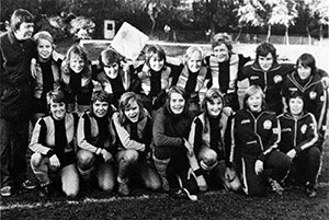 I DM gick man däremot hela vägen och spöade konkurrenten Jakobsberg i finalen. Även junior-DM vanns av Hammarby, med Älvsjö AIK som runner-up. Dessutom vann reservlaget sin serie. Över pingst gjorde fotbollsdamerna sin första resa utomlands då Västtyskland besöktes. Man deltog i en turnering i Bruchsal där lag från fem länder ställde upp. Det blev idel segrar och en målskillnad på 28-0. Laget fick ett bidrag av Hammarby på 7 000 kronor så det kostade bara 200 för varje spelare. I Västtyskland stod Ronnie Hellström och Roland Sandberg som värdar. Hammarby hade en knippe landslagsspelare: Gun Hellestig, Ingalill Arvling, Lena Isberg, Ann Jansson och Britt-Marie Karlsson. Östra Svealand750504 (Hammarby IP)Hammarby-Ronna 8-0 (3-0) Ann Jansson 2, övriga okända Om matchen: Hammarby totalt dominanta Ronnas två ”avslut” var bakåtpassningar från Bajenbackar. 750514 (Bolindervallen) Jakobsberg-Hammarby 750525 Bälinge-Hammarby 0-0 750531 (Hammarby IP) Hammarby-Väster 6-0 (4-0) 1-0 0.20 Eva-Maria Karlsson, 2-0 Eva-Maria Karlsson straff, 3-0 Ann Jansson, 4-0 Ann Jansson, 5-0 Ann Jansson, 6-0 Eva-Maria Karlsson Om matchen: Hammarby dominerade stort i den första halvleken. I andra kom Väster tillbaka och pressade på rätt bra, dock utan att vaska fram några riktiga farligheter. Bajens mål kom efter två kontringar. 750608 (Bårsta IP) Södertälje-Hammarby 0-1 (0-1) Ann Jansson 750823 Hammarby-Södertälje 2-0 750831 Väster-Hammarby 0-2 750906 Hammarby-Bälinge 750917 Hammarby-Bälinge 3-1 (1-1) Hammarby: Susanne Haglund, Christina Persson, Gunilla Karlsson Bälinge: Marja Norberg 750921 Ronna-Hammarby 0-0 750927 Norrköping-Hammarby 2-5 Norrköping: Karin Ohlsson, Marianne Svensson Hammarby: Britt-Marie Karlsson 3, Ann Jansson, Lena Isberg 751001 (Hammarby IP) Hammarby-Norrköping 4-0 (2-0) Ann Jansson 2, Pia Ewald, Kristina Leino 751005 Hammarby-Lotorp 3-0 (0-0) Ann Jansson, Britt-Marie Karlsson, Eva-Maria Karlsson 751011 (Hammarby IP) Hammarby-Jakobsberg 1-0 (0-0) 1-0 53 Lena Isberg (Britt-Marie Karlsson) Om matchen: Hammarby tog hem såväl serie som DM i och med segern. Laget vann rättvist i en nervös match. SM750803 (1 omg)Gideonsbergs IF-Hammarby 0-1 Britt-Marie Karlsson 750822 (2 omg, Årsta IP) Hammarby-Hemse BK 3-0 750830 (kvartsfinal) Öxabäcks IF-Hammarby 1-0 (1-0) 1-0 20 Ann-Christine Lindkvist Publik: 650 DM740413 (1 omg)Hammarby-Rönninge SK 15-0 Ann Jansson 9, Eva-Maria Karlsson 2, Maria Wiman 2, Gunilla Karlsson, Britt-Marie Karlsson Hammarby-Vendelsö IK wo (2 omg) Hammarby-Ekopojkarna 5-0 (kvartsfinal) 750611 (semifinal) Hammarby-AIK 4-0 (4-0) Om matchen: Klasskillnad. AIK hade inte en enda målchans. 751011 (final, Hammarby IP) Hammarby-Jakobsbergs GoIF 1-0 (0-0) 1-0 53 Lena Isberg (Britt-Marie Karlsson) Matchen gällde även som seriematch och betydde att Hammarby vann serien. Träningsmatcher750509 (Jakobsbergscupen, gruppspel)Hammarby-IFK Helsingfors 7-0 Ann Jansson 4, Susanne Haglund, Jeanette Berg, Helena Larsson Om matchen: Hammarby saknade sex spelare men kunde ändå köra över det finska laget. 750510 (Jakobsbergscupen, gruppspel) Hammarby-IFK Malmö 3-0 Britt-Marie Karlsson 2, Kristina Leino 750510 (Jakobsbergscupen, gruppspel) Hammarby-Öxabäcks IF 0-0 750511 (Jakobsbergscupen, match om 3:e pris) Jakobsbergs GoIF-Hammarby 2-1 (2-0) Jakobsberg: Birgitta Söderström, Inga-Lena Berg Hammarby: Helena Larsen 750517-19 (i Bruchsal, Västtyskland) Hammarby-AVS Freudenheim 3-0 (gruppspel) Hammarby-SV Obrigheim 9-0 Hammarby-SV Armania Hannover 2-0 (semifinalspel) Hammarby-SC Wertheim 5-0 Hammarby-Untergrobach FS 0-0 Hammarby-DFC Ostbahn, Wien 4-0 (semifinal) Hammarby-Bruchsal 4-0 P: 2 500 (final) Hammarbys målskyttar: Ann Jansson 10, Eva-Maria Karlsson 8, Pia Ewald 3, Lena Isberg 2, Isa Löfstedt, Maria Wiman, Susanne Haglund, Gunilla Karlsson, Britt-Marie Kalsson 750810 Södertälje-Hammarby 0-1 (Kringlan Cup) 750810 (final, Kringlan Cup) Hammarby-Jakobsberg 5-0 (3-0) Ann Jansson 3, Eva-Maria Karlsson, Britt-Marie Karlsson Trångsunds IF:s skinkcup, 751209Finnströmskamraterna, Åland-Hammarby 2-5Hammarby-Jakobsberg 4-0 (final) SpelartruppenMålvakter:26. Gun Hellestig, 20 år 1. Agneta Åkesson, 17 år Försvarare: 11. Boel Fahlström, 24 år 22. Susanne Haglund, 17 år 5. Lena Isberg, 15 år 2. Barbro Jämtmark, 39 år 12. Riita Kaikonen, 18 år 14. Eva-Maria Karlsson, 18 år (Lycksele IF) 13. Kristina Leino, 18 år (Bro IK) 6. Kristina Westin, 26 år Mittfältare: 21. Jeanette Bergh, 14 år (IF Cobran) 23. Marianne Crona, 22 år 8. Pia Ewald, 18 år 24. Ann-Charlotte Johansson, 20 år 19. Britt-Marie Karlsson, 22 år (IK Göta) 7. Gunilla Karlsson, 31 år 20. Helena Larsen, 16 år (Viggbyholm IK) 9. Agneta Norman, 18 år 15. Christina Persson, 22 år (IFK Rättvik) Anfallare: 3. Inga-Lill Arvling, 19 år 10. Ann Jansson, 17 år 4. Birgitta Johansson, 19 år 17. Isa Löfstedt, 17 år 25. Lena Similä, 16 år 18. Ann Ström, 20 år 16. Maria Wiman, 20 år Övriga: Ulla Nord, 23 år Susanna Rosen Helena Schöldsten Lena Söderström Tränare och lagledare: Christer Molander ÖvrigtJunior-DMHammarby-Älvsjö AIK 1-0FriidrottUnder året kom 55 aktiva över från Hellas till Hammarby. Skälet var att man tyckte att Hammarbys ideologi, där alla fick vara med och ingen skulle drabbas för att man inte hade råd med utrustning mm, var lockande. Hellas hade uppenbarligen ett annat sätt att se på saker. Därmed förstärktes Hammarbys friidrott och det skulle märkas i resultatlistorna åren framöver. I SM kom längdhopparen Roand Fröderberg på 8:e plats i längd efter ett hopp på 6,89. Tidigare på sommaren hade han klarat 7,14, vilket skulle ha betytt en bra placering i SM. Junioren Lisa Lundin kom tvåa i B-SM i höjd på 1,60. Hon kom även tvåa i spjut. I spjut vann hon junior-DM. Fem Hammarbyungdomar kvalade in till UP (ungdomspropaganda)-finalerna i Östersund, en tävling för landets bästa. De fem var Carola Jönsson, 300 