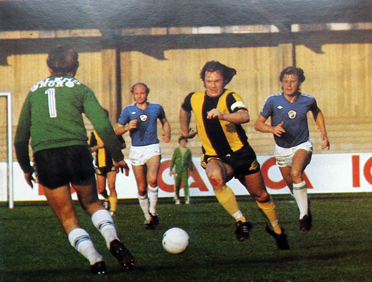 Hammarby förberedde sig genom en resa till Haiti och spel mot både hemmalandslaget och USA:s VM-lag. Bajens vårsäsong svängde rejält. I den jämna tabellen åkte laget upp och ner från omgång till omgång. Efter derbyvinsten över AIK i den sjätte omgången (3-0) var man bäst i stan med sin mittenplacering. Omgången efter låg man näst sist för att sedan spöa Öster hemma och åka upp till mitten igen. Efter åtta omgångar skiljde det fyra poäng mellan ledaren Elfsborg och kölaget Derby. Under sommaruppehållet drog Hammarby över till USA för möten med några lokala lag. Den 13 juli flög sammanlagt 25 personer plus 15 supportrar över. Hammarby hade med sig i stort sett ordinarie trupp men förlorade de två matcherna. Efter en bra sommar med många inspelade poäng nosade Hammarby på medaljer. En poäng på fyra matcher skickade de drömmarna i papperskorgen och Bajen spelade av hösten utan någon större dramatik, aldrig allvarligt indraget i bottenstriden. Sjundeplatsen innebar att Bajen blev bästa lag i stan, något som bara hänt två gånger tidigare, 1921 och 1961. I den allsvenska skytteligan blev Billy Ohlsson bäst med sina åtta mål. Med det delade han en 10:e plats. 1974 spelade den första utländska spelaren i allsvenskan. 1977 var det dags för den första i Hammarby. Det var tunisiern Melki Amri som spelade 3 matcher. Hammarby vann DM detta år. Inför Stockholms Fotbollförunds 60-årsjubileum ändrade man turneringen och införde handikappstraffar för lag i lägre serier, en straff per division, och döpte turneringen till Stockholm Cup. Klass 3-laget Stehe Rovers tog sig ända till final där alltså Bajen blev för svåra (3-4). Bajens landslagsrepresentationvar, förutom Ronnie Hellström i Kaiserslauten, även Klas Johansson som gjorde 3 landskamper och Mats Werner som var med på vinterlägret i Spanien. Klasse gjorde en halvlek mot Danmark (1-0) och fick fina lovord efter matchen borta mot Ungern, som Sverige dock förlorade med 3-0. I matchen mot Polen (1-2) hade han det svårare. Klas Johansson representerade även U21-landslaget och i J-landslaget spelade Anders Ahlinder, Mikael Andersson och Thomas Dennerby. Ahlinder och Christer Lindgren spelade även i P-landslaget. Hammarbys juniorlag vann ungdomsserien men åkte ut i semifinalen i slutspelet. Däremot gick laget hela vägen vid en turnering i Haag i Holland där lag från fem länder var representerade. Under året avled spelaren, och senare Hammarbys tränare under 18 år, Folke Adamsson. Allsvenskan770412 (Fotbollsstadion)Hammarby-Kalmar 0-1 (0-0) 0-1 55 Johny Erlandsson Matchens DN-lirare: Kenneth Bojstedt, Kalmar Domare: Arne Adler, Kävlinge/J-O Malm, Märsta, Karl-Erik Eriksson, Uppsala Publik: 6 359 Om matchen: Hammarby förlorade efter ett missförstånd i försvaret. 770423 (Söderstadion) Hammarby-Örebro 2-1 (1-1) Annons Biljett 0-1 14 Stefan Lundin, 1-1 30 Billy Ohlsson, 2-1 88 Billy Ohlsson (Bo Mattsson) Matchens DN-lirare: Billy Ohlsson, Hammarby Domare: Sven-Erik Grönlund, Kvissleby Publik: 6 246 Om matchen: Hammarbys segermål kom då Mats Werner stod offside. Han inverkade dock inte på spelet så huvuddomaren godkände målet. 770501 (Ryavallen) Elfsborg-Hammarby 2-1 (2-0) 1-0 22 Jackie Mattsson, 2-0 27 Thomas Ahlström, 2-1 86 Kenneth Ohlsson Matchens DN-lirare: Thomas Ahlström, Elfsborg Domare: Lars-Åke Björck, Partille/Bertil Andersson, Hisings Backa, Leif Randers, Göteborg Publik: 9 263 Om matchen: Elfsborg var totalt överlägset i den första halvleken men resultatet stannade vid 2-0. Hammarby hade en del chanser och i slutet resulterade en. 770504 (Folkungavallen) Derby-Hammarby 0-0 Matchens DN-lirare: Ruben Svensson, Derby Domare: Karl-Gösta Björkman, Lagan/Thorsten Gustavsson, Ljungby, Sven-Olof Karlsson, Växjö Publik: 2 838 Om matchen: Hammarby hade det mesta av spelet och 4-5 bra chanser brändes. 770507 (Söderstadion) Hammarby-Landskrona 1-2 (1-1) Annons 0-1 10 Mats Aronsson, 1-1 22 Mats Werner (Kenneth Ohlsson), 1-2 80 Torbjörn Lindström Matchens DN-lirare: Jan-Erik Sjöberg, Landskrona Domare: Alf Håkansson, Lidköping/Jan-Olof Malm, Märsta, Sune Andersson, Uppsala Publik: 4 924 Om matchen: Landskrona började bäst men Hammarby kom tillbaka och hade rättvist oavgjort i halvtid. 770512 (Fotbollsstadion) AIK-Hammarby 0-3 (0-0) Annons Annons 2 0-1 55 Billy Ohlsson (Jan Sjöström), 0-2 59 Mats Werner (Klas Johansson), 0-3 76 Jan Sjöström (Klas Johansson) Matchens DN-lirare: Jan Svensson, Hammarby Domare: Jan-Ingemar Svensson, Ängelholm/J-O Svelander, Danderyd, T Andersson, Sundbyberg Publik: 14 917 Om matchen: Efter en ganska jobbig inledning på säsongen smällde Bajen äntligen till i derbyt mot AIK. Gladast var lagkaptenen Jan Sjöström som satte en balja och passade till en annan. 770522 (Nya Ullevi) Göteborg-Hammarby 3-2 (1-1) Biljett 0-1 25 Kenneth Ohlsson (Billy Ohlsson), 1-1 43 Olle Nordin, 2-1 48 Lennart Ottordahl (Jan Nilsson), 2-2 73 Billy Ohlsson (Börje Forsberg), 3-2 78 Jan Nilsson (Olle Nordin) Domare: Arne Axelsson, Skärblacka/Johnny Börjesson, Varberg, L O Eliasson, Kungsbacka Publik: 22 904 Om matchen: Hammarby spelade en mycket fin fotboll som dock inte räckte till i den här jämna matchen. 770530 (Söderstadion) Hammarby-Öster 1-0 (0-0) Biljett 1-0 86 självmål (Tommy Svensson styrde in ett inlägg från Mikael Rönnberg) Matchens DN-lirare: Tom Åhlund, Hammarby Domare: Ingemar Johansson, Skövde Publik: 5 556 Om matchen: Hammarby fick revansch för cupfinalsförlusten direkt och vann en överraskande men rättvis seger. 770602 (Malmö Stadion) Malmö FF-Hammarby 6-0 (1-0) 1-0 6 Roland Andersson, 2-0 47 Tommy Hansson (Ingemar Erlandsson), 3-0 66 Tommy Hansson (Bo Larsson), 4-0 75 Tommy Hansson (Claes Malmberg), 5-0 79 Tommy Larsson, 6-0 83 Thomas Sjöberg Matchens DN-lirare: Ingemar Erlandsson, Malmö Domare: Göran Lundberg, Uppsala/J Börjesson och B Pettersson, Varberg Publik: 7 781 Om matchen: Malmö