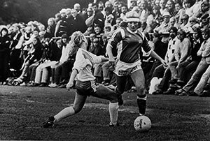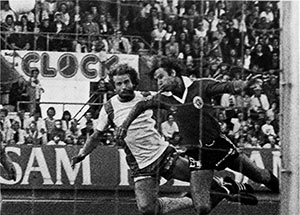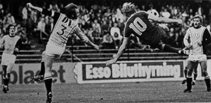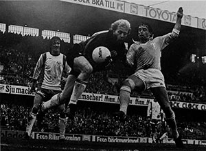 10 september: Ulf Eriksson lyfter in 2-0 bakom Lennart Ljung. Ur Hammarbys arkiv. Foto: ROLLE RYGIN. |