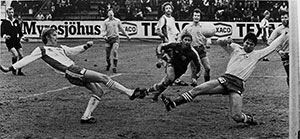 10 september: Kenneth Ohlsson gör 1-0. Peder Amberntsson och Bosse Mattson är hjlälplösa. Ur Hammarbys arkiv. Foto: ROLLE RYGIN. |