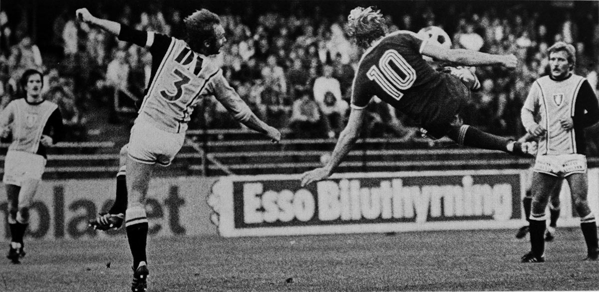 14 juni: Thomas Dennerby efter 1-0. Det här året var kanske första gången sedan tidigt 1920-tal som Hammarby fotboll på allvar utmanade om SM-guldet. Bild i Hammarbyiten 61/1979. Ur Hammarbys arkiv. Foto: ROLLE RYGIN. |