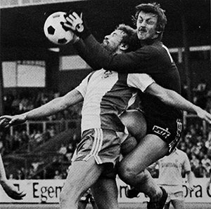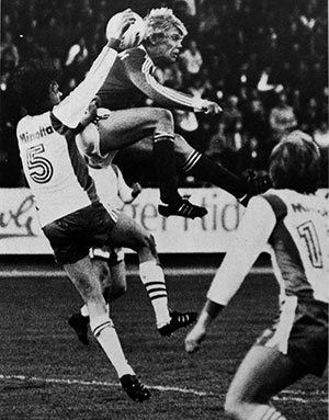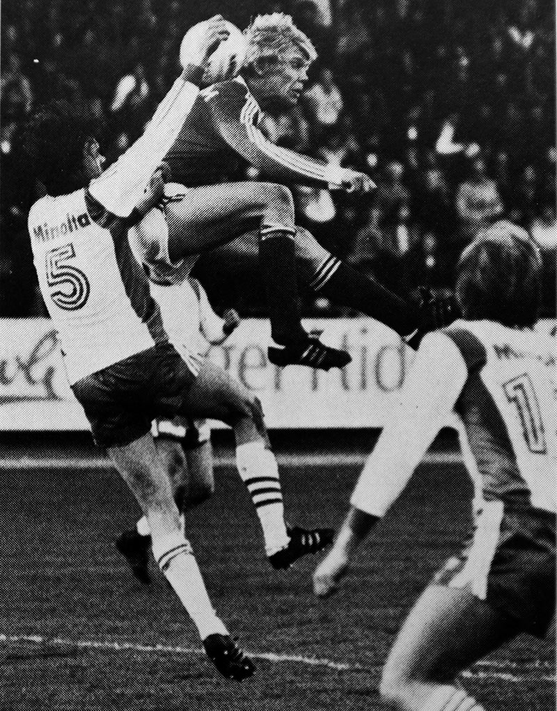 14 juni: Mats Werner, på knä, har just nickat in 3-1. Ur Hammarbys arkiv. Foto: ROLLE RYGIN. |