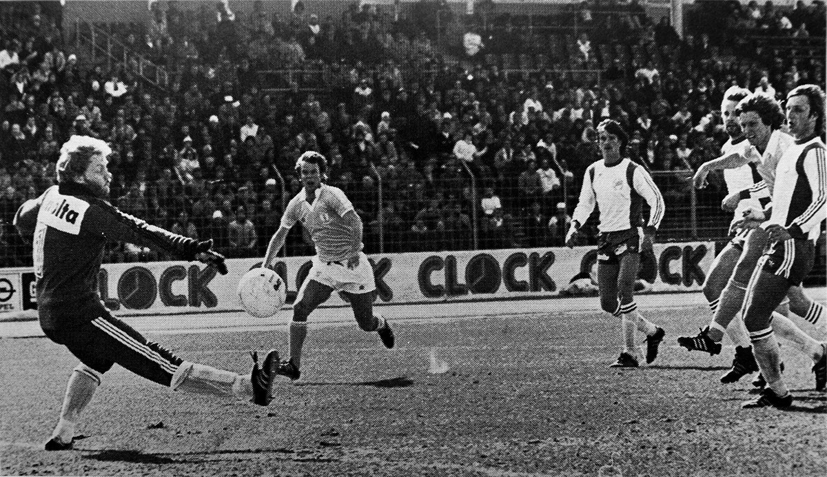 28 maj: Mats Werner jublar efter sitt 1-0-mål. Bild i Hammarbyiten 60/1979. Ur Hammarbys arkiv. Foto: ROLLE RYGIN. |