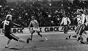 31 januari: Ulf Eriksson stöter inte 2-0 bakom Djurgårdsmålvakten Lars Pettersson. Ur Hammarbys arkiv. Foto: ROLLE RYGIN. |