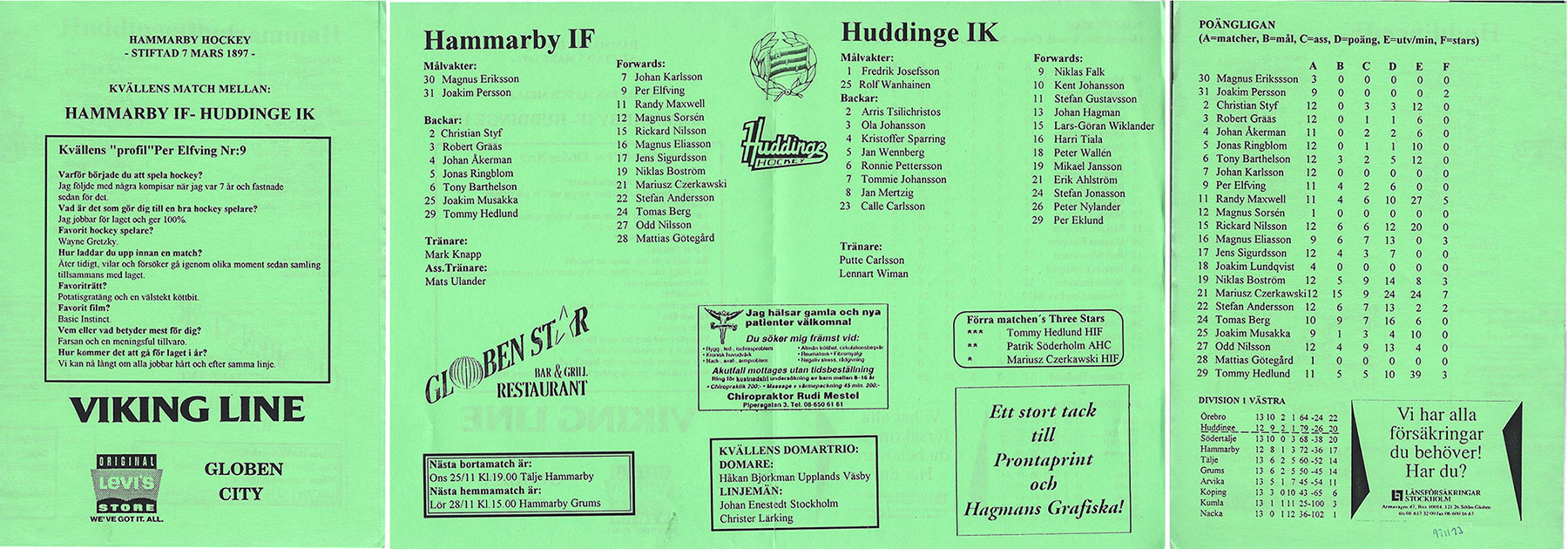 Denna gång blev det dock bara ettårigt. Division 4 Stockholm920928 Minneberg-Hammarby 10-3921012 Ösmo-Hammarby 15-5 921026 Hammarby Jakobsberg 12-15 930208 Skå-Hammarby 14-6 930222 Jakobsberg-Hammarby 10-0 (wo?) 930308 Söder-Hammarby 30-11 930315 Hammarby-Minneberg 12-11 (eller tvärtom. Enligt DN:s tabell så vann Hammarby) Ishockey