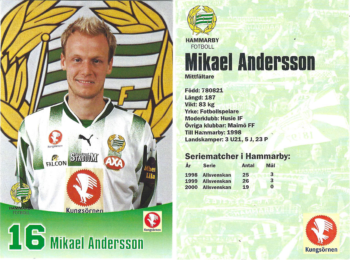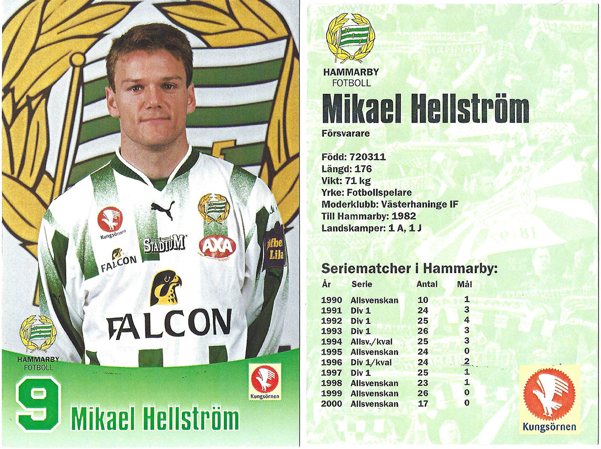 SM010519 Hammarby-IFAS 1-1010519 Hammarby-FIFH Malmö 3-2 010519 Hammarby-SUGI Göteborg 5-1 010519 IFAS-Hammarby 1-6 010520 FIFH Malmö-Hammarby 6-1 010520 SUGI Göteborg-Hammarby 3-5 010520 Hammarby-FIFH Malmö 1-3 (final) StockholmsserienHammarby-Bajen 4-2Bajen-BBU 3-4 BBU-Hammarby 7-5 BBU-Bajen 2-3 Bajen-Hammarby 4-3 Hammarby-BBU 2-7 Hammarby-Bajen 3-1 BBU-Hammarby 2-2 BBU-Bajen 3-2 Bajen-Hammarby 4-2 Hammarby-BBU 4-7 Bajen-BBU 0-3 Marathon Goalball EliteIFAS Dynamite-Hammarby 5-2Hammarby-SUGI 5-1 Cesis-Hammarby 0-1 Hammarby-Evision 4-3 The Dutch Bonobos-Hammarby 1-0 IFAS Dynamite-Hammarby 1-2 Hammarby-SUGI 9-0 Cesis-Hammarby 0-3 Hammarby-Evision 7-0 The Dutch Bonobos-Hammarby 1-5 Hammarby-Cesis 1-0 (semifinal, Lions Cup) IFAS Dynamite-Hammarby 3-2 sd (final, Lions Cup) HandbollTill den här säsongen värvades tränaren Magnus Grahn från Nordmaling. Dessutom värvades ett antal spelare, bland annat talangen Lukas Karlsson från Nyköping och landslagsmeriterade Mikael Schjölin. Laget kvalificerade sig till Allsvenskan/Kvalsvenskan men kunde ännu inte slåss om elitserieplatser. Då Eriksdalshallen renoverades flyttade man hemmamatcherna till Brännkyrkahallen. Division 1 Norra Höst001003 Hammarby-Sikeå 34-24001008 Skånela-Hammarby 28-23 Skånela: Margus Varik 8, Jonas Danielsson 7, Johan Rosander 4, Mattias Ryd 3, Tomas Hagman 2, Fredrik Blank, Niklas Engdal, Stefan Sandberg, Frenne Lundström Hammarby: William Nguesseu 6, Micael Schjölin 5, Andreas Bergström 3, Lukas Karlsson 3, Ulf Gustavsson 2, Göran Rönngren 2, Fredrik Bohlin, Daniel Källberg 001014 (Brännkyrkahallen) Hammarby-Kärra 27-19 (12-8) Hammarby: Ulf Gustavsson 5, Lukas Karlsson 4, Andreas Bergström 3, Daniel Källberg 3, Göran Rönngren 3, Micael Schjölin 3, Fredrik Bohlin, Mikael Nordahl 2, Johnny Sundberg, William Nguesseu Kärra: Magnus Björklund 7, Gustav Almqvist 3, Markus Gustavsson 3, Peter Olsson 2, Mikael Maniszalchi 2, Andreas Moberg, Mattias Östman Publik: 700 001019 Borlänge-Hammarby 23-20 (11-9) Borlänge: Andreas Bergdahl 9, Niklas Snell 3, Erik Axelsson 3, Andreas Samuelsson 3, Kim Stenberg 2, Dennis Schelin 2, Niklas Eriksson Hammarby: Göran Rönngren 4, Lukas Karlsson 3, William Nguesseu 3, Mikael Nordahl 3, Daniel Källberg 3, Andreas Bergström, Fredrik Bohlin, Ulf Gustavsson, Micael Schjölin 001029 (Farstahallen) Söder-Hammarby 33-23 (13-11) Söder: Robert Jansson 10, Calle Tagesson 7, Elie Hamamgi 5, Tobias Nilsson 3, Kim Ahlgren 3, Micha Bruman 3, Niklas Ljungberg, Andreas Fjällström Hammarby: William Nguesseu 4, Lukas Karlsson 3, Daniel Källberg 3, Hans Jonsson 3, Mikael Nordahl 3, Ulf Gustavsson 2, Rickard Rosén 2, Fredrik Bohlin, Göran Rönngren, Johnny Sundberg Publik: 400 001107 (Brännkyrkahallen) Hammarby-Mantorp 29-19 (17-12 Annons Hammarby: William Nguesseu 7, Mikael Nordahl 4, Lukas Karlsson 4, Ulf Gustavsson 3, Lars Jonsson 3, Göran Rönngren 2, Rickard Rosén 2, Johnny Sundberg 2, Daniel Källberg, Fredrik Bohlin Mantorp: Markus Lundin 5, Magnus Karlsson 4, Rickard Olsson 3, Robert Ström 3, Anders Johansson 2, Love Asplund, Jan Andersson 001111 (Brännkyrkahallen) Hammarby-Lindeskolan 39-19 (17-9) Hammarby: MIkael Nordahl 8, Lukas Karlsson 6, Daniel Källberg 6, Ulf Gustavsson 5, Lars Jonsson 4, Rickard Rosén 3, Johnny Sundberg 3, William Nguesseu 3, Fredrik Bohlin Lindeskolan: Mikael Martinsson 5, Albert Jonsson 4, Bengt Zetterlund 4, Niklas Janlen 3, Henrik Arenvang 2, Peter Hellström 001118 Tyresö-Hammarby 18-33 (10-17) Tyresä: Micael Östlund-Bekele 6, Mats Ericson 5, Lars Arvidsson 3, Surachet Premsot, Fredrik Sewén, Stefan Larsson, Alexander Annelin Hammarby: Daniel Källberg 8, Ulf Gustavsson 5, Lars Jonsson 5, Micael Schjölin 4, Göran Rönngren 3, Lukas Karlsson 3, Andreas Bergström 2, Magnus Almqvist, Rickard Rosén, Jonas Bergman 001125 (Brännkyrkahallen) Hammarby-Irsta Västerås 24-23 (11-11) Hammarby: William Nguesseu 8, Daniel Källberg 5, Göran Rönngren 4, Ulf Gustavsson 4, Lukas Karlsson 2, Johnny Sundberg Irsta/Västerås: Mathias Fredriksson 8, Rickard Norström 4, Marcus COnrad 3, Jonas Busk 2, Jens Busk, Ola Anto, Mikael Lindgren, Daniel Skipper, Henrik Berglund, Mattias Söder 001201 Falköping-Hammarby 19-25 (10-14) Falköping: Per Hellström 5, Tobias Glans 3, Niklas Jansson 3, Stefan Hedfors 3, Fredrik Falkhage 2, Markus Viberg, Daniel Ekberg, Patrik Lageson Hammarby: William Nguesseu 8, Daniel Källberg 6, Micael Schjölin 5, Lukas Karlsson 2, Fredrik Bohlin, Ulf Gustavsson, Göran Rönngren, Johnny Sundberg 001209 Cliff-Hammarby 14-25 (8-15) Cliff: Peter Pettersson 4, Marcel Lundstad 3, Christer Andersson 2, Dimitris Dirhalidis 2, Mikael Ekholm 2, Per Loreby Hammarby: William Nguesseu 7, Micael Schjölin 6, Ulf Gustavsson 3, Lukas Karlsson 2, Fredrik Bohlin 2, Daniel Källberg 2, Rickard Rosén, Göran Rönngren 001219 (Brännkyrkahallen) Hammarby-Söder 24-19 (10-8) Hammarby: William Nguesseu 6, Lukas Karlsson 5, Ulf Gustavsson 4, Daniel Källberg 4, Fredrik Bohlin 3, Göran Rönngren, Rickard Rosén Söder: Robert Jansson 6, Calle Tagesson 4, Kim Ahlgren 3, Tobias Nilsson 3, Elie Hamamgi 2, Micha Bruman Publik: 950 010102 (Brännkyrkahallen) Hammarby-Borlänge 29-24 (11-14) Annons Hammarby: Ulf Gustavsson 8, Micael Schjölin 6, Daniel Källberg 6, William Nguesseu 6, Lukas Karlsson, Fredrik Bohlin, Jonas Bergman Borlänge: Kim Stenberg 5, Andras Bergdahl 5, Erik Axelsson 5, Niclas Snell 3, Andreas Samuelsson 3, Niklas Eriksson, Markus Nilsson, DennisSchellin 010106 Kärra-Hammarby 17-30 010113 (Brännkyrkahallen) Hammarby-Skånela 29-23 (18-11) Annons Hammarby: William Nguesseu 7, Fredrik Bohlin 4, Lukas Karlsson 4, Rickard Rosén 4, Ulf Gustavsson 3, Lars Jonsson 3, Göran Rönngren 3, Mikael Svensson Skånela: Jens Söder 5, TOmas Hagman 5, Jonas Danielsson 4, Stefan Sandberg 4, Mattias Ryd 3, Frenne Lundström, Johan Rosander 010117 Sikeå-Hammarby 23-16 (11-5) Sikeå: Mikael Lund 8, Per Jonsson 5, Stefan Marklund 4