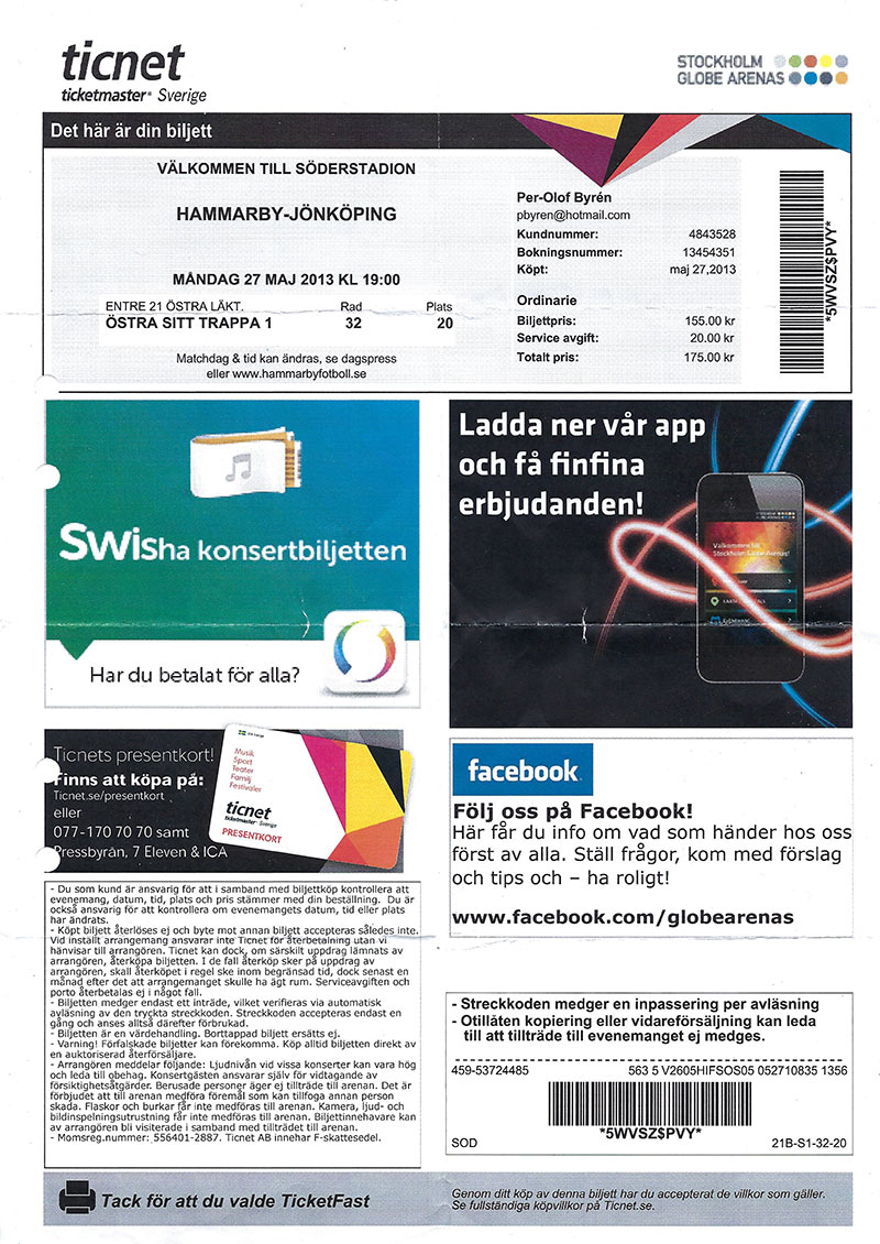 Där blev dock BK Joker för svåra. Även de andra lagen hade det knepigt med kvalspelet. F1-laget misslyckades att hålla sig kvar i ettan och F2 missade i kvalet till tvåan. Vid DM för tremanna kom Fredrik Bäckström, Marcus Billskär och Peter Dannfeldt på femte plats. Vid SM kom laget med Fredrik Bäckström, Marcus Billskär och Johan Brunsberg på 4:e plats. Vid junior-DM vann Patrik Hillborg klassen Pojkar junior, före Andreas Ekhamre. Mellanallsvenskan Grupp B120908 Hammarby-BK Glam 7-13120915 Hammarby-Djurgården 10-9 120922 BK Domino-Hammarby 14-6 120922 BK Flax-Hammarby 12-8 121013 Hammarby-AIK 18-2 121020 Hammarby-Västerås SK 13-7 121027 Hammarby-Uppsala BC 90 17-3 121117 IFK Norrköping-Hammarby 13-7 121117 BK Brio-Hammarby 13-7 121124 AIK-Hammarby 13-7 121124 BK Amiki-Hammarby 10-10 121201 Hammarby-BK Triss 16-3 130112 Uppsala BC 90-Hammarby 7-13 130119 Hammarby-BK Nobel 9-11 130126 Djurgården-Hammarby 17-3 130127 Stånga IF-Hammarby 8-12 130216 Hammarby-BK Bågen 8-12 130223 Hammarby-BK Amiki 130303 Hammarby-Gävle KK 12-8 130324 Hammarby-Stånga IF 12-8 130406 Team Baltzar BC-Hammarby 12-8 130406 BK Kaskad-Hammarby 15-4 Slutspel till Elitserien8-delsfinal: (Jönköping Arena)130421 Team Malmoe BK-Hammarby 17-3 (4-1, 3-2, 5-0, 5-0) 130421 Hammarby-Team Malmoe BK 12-8 (2-3, 4-1, 4-1, 2-3) 130421 Team Malmoe BK-Hammarby 4-6 (2-3, 2-3) Kvartsfinal: (Nässjö Bowlinghall) 130427 BK Joker-Hammarby 15-5 (4-1, 2-3, 4-1, 5-0) 130427 Hammarby-BK Joker 4-11 (2-3, 1-4, 1-4) Division 1 S Svealand Grupp B120908 SK Nova-Hammarby F1 11-9120909 IK Pärlan-Hammarby F1 8-12 120915 Hammarby F1-Sundbybergs IK F 13-7 120922 Hammarby F1-Tureberg IF 10-10 121013 Sigma BK A-Hammarby F1 15-5 121013 Sundbybergs IK F-Hammarby F1 7-13 121020 Hammarby F1-BK Brio F 13-7 121027 Hammarby F1-Åkeshov BK 10-10 121117 Hammarby F1-Tyresö BK A 9-11 121124 Hammarby F1-AIK F 13-7 121201 Hammarby F1-BK Ax 13-7 130112 Åkeshov BK-Hammarby F1 14-6 130119 BK Trol-Hammarby F1 16-4 130119 Högdalen BK-Hammarby F1 10-10 130126 Hammarby F1-Stureby BK F 10-10 130216 Hammarby F1-BwK Ankaret 6-14 130223 Stureby BK F-Hammarby F1 15-5 130223 AIK F-Hammarby F1 18-2 130302 Hellas BK A-Hammarby F1 11-9 130302 Fredrikshof IF-Hammarby F1 14-6 130323 Hammarby F1-Sigma BK A 5-15 130406 Hammarby F1-Vendelsö BK 15-5 Kval till Division 1 Södra B, SvealandSemifinal: (Upplands Väsby Bowlinghall)130420 Hammarby F1-Uppsala BC 90 F 11-8 (1-4, 3-1, 4-1, 3-2) 130420 Uppsala BC 90 F-Hammarby F1 2-13 (1-4, 0-5, 1-4) Final: (Högdalens Bowlingpalatz) 130428 Vendelsö BK-Hammarby F1 10-10 (3-2, 1-4, 1-4, 5-0) 130428 Hammarby F1-Vendelsö BK 4-11 (1-4, 2-3, 1-4) Division 3 Ö Svealand Grupp A120908 Hammarby F2-Concordia IF 9-11120922 Pocket Club-Hammarby F2 12-7 120923 IK Hephata-Hammarby F2 9-11 120929 Hammarby F2-Värtans IK 6-14 120929 Hammarby F2-BK Smile 15-5 121013 BK Arkos-Hammarby F2 11-9 121021 BS 23/FP-Hammarby F2 9-10 121027 Hammarby F2-BK Råsunda 8-12 121117 Hammarby F2-Fredrikshof IF F 15-5 121124 IFK Stockholm-Hammarby F2 3-17 121202 Hammarby F2-Scania IF F 13-7 130112 Hammarby F2-BS 23/FP 17-3 130113 Scania IF F-Hammarby F2 6-14 130119 Hammarby F2-IFK Stockholm 12-7 130127 Fredrikshof IF F-Hammarby F2 15-4 130209 BK Råsunda-Hammarby F2 4-16 130216 Hammarby F2-BK Arkos 18-2 130223 BK Smile-Hammarby F2 4-16 130302 Värtans IK-Hammarby F2 12-8 130316 Hammarby F2-Pocket Club 15-5 130323 Hammarby F2-IK Hephata 17-2 130406 Concordia IF-Hammarby F2 5-15 Kval till Division 2Final: (Stockholm Rinkeby)130427 Bålsta BC F-Hammarby F2 12-8 (2-3, 4-1, 4-1, 2-3 130427 Hammarby F2-Bålsta BC F 8-12 (1-4, 3-2, 3-2, 5-0) 130427 Bålsta BC F-Hammarby F2 2-3 SpelartruppenA-lagetKenneth Aspögård, 3 matcherJimmy Bengtson, 19 Marcus Billskär, 18 Johan Brunsberg, 23 Fredrik Bäckström, 26 Peter Dannfeldt, 25 Andreas Ekhamre, 14 Dennis Falk, 8 Victor Forss, 12 Patrik Hillborg, 24 Kristian Keber, 3 K-J Mattsson, 1 Altti Mattila, 8 Peter Sainio, 25 Allan Sennevall, 24 Robert Wikman, 3 Niclas Öhrn, 1 F1Kenneth Aspögård, 9Jimmy Bengtson, 1 Marcus Billskär, 3 Tommy Blom, 26 Ingemar Brännmo, 23 John Carlson, 6 Bo Collinge, 1 Andreas Ekhamre, 1 Victor Forss, 4 Jonas Gimhag, 5 Mikael Gimhag, 2 Albin Hellström, 8 Patrik Hillborg, 2 Marcus Jansson, 4 Anders Karlsson, 23 Kristian Keber, 6 Nicklas Kihlberg, 2 Altti Mattila, 14 K-J Mattsson, 25 Frank Welander, 14 Stuart West, 5 Robert Wikman, 22 Niclas Öhrn, 14 F2Göran Ahlstrand, 9Ewalena Altenfors, 5 Sven Altenfors, 19 Kenneth Aspögård, 2 Marcus Billskär, 1 Ingemar Brännmo, 2 Rolf Börjesson, 1 Bo Collinge, 23 Joakim Dahlqvist, 19 Andreas Ekhamre, 2 Mathias Fredriksson, 3 Jonas Gimhag, 15 Mikael Gimhag, 12 Vavva Gimhag, 16 Ulf Gustafsson, 23 Albin Hellström, 1 Max Innergård, 1 Marcus Jansson, 3 Jim Jäderdal, 1 Anders Karlsson, 2 Nicklas Kihlberg, 8 Kristian Keber, 8 Rakel Norberg, 2 Sofia Norberg, 3 Jan Rosén, 1 Åsa Tassdal, 5 Kenth Wallin, 1 Elisabeth Wallin, 2 Frank Welander, 6 Stuart West, 5 Bengt Åkerström, 4 Niclas Öhrn, 1 Bowling, damer