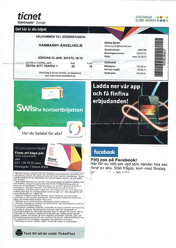 Några spelare fick chansen i landslaget. Det var Mattias Björkebäck, Peter Blaha, Stefan Obradovic och Niklas Ståhle. Blaha blev Stor Grabb under året. Alexander Rappestad tog en plats i sjumannalandslaget under året. I U18-landslagssammanhang var Felix Emt och Alexander Duncan med på ett vinterläger. Duncan kvalificerade sig för spel i EM i mars, medan Emt drabbades av en skada. Allsvenskan Norra130509 Hammarby-Uppsala inställd130512 Södertälje-Hammarby 3-43 130525 Uppsala-Hammarby 29-47 130615 Hammarby-Karlstad wo (15-0) 130629 Karlstad-Hammarby 14-57 130810 Hammarby-Stockholm Exiles 0-57 130817 Hammarby-Enköping 8-38 130824 Enköping-Hammarby 13-20 130910 Stockholm Exiles-Hammarby 22-3 130914 Hammarby-Södertälje 39-13 Slutspel130921 Hammarby-Vänersborgs RK 25-27 (semifinal)130928 Vänersborgs RK-Hammarby 24-13 SM 7-manna130420 Hammarby-Uppsala 42-0 (kval)130420 Hammarby-Linköping 35-7 130420 Hammarby-Södertälje 50-0 (kvalsemi) 130420 Hammarby-Enköping 5-55 (kvalfinal, Hammarby vidare) 130831-0901 Hammarby-Linköping 34-0 130831-0901 Hammarby-Södertälje 10-21 130831-0901 Hammarby-Enköping 5-38 130831-0901 Hammarby-Kalmar 24-5 Mälardalsserien130505 Hammarby B-Stockholm Berserkers 108-0130519 Hammarby B-Exiles C 33-11 130526 Hammarby B-Västerås 37-29 130602 Uppsala/Sandviken-Hammarby B 12-15 130811 Linköping-Hammarby B 22-20 130818 Hammarby B-Attila 24-39 130825 Enköping B-Hammarby B 0-0 130907 Södertälje B-Hammarby B 47-15 Stockholm Tens10-mannaturnering, Årsta 3-4 augustiHammarby-The Tropics 55-0 Hammarby-Örebro 63-3 Hammarby-Vänersborg 19-17 (semifinal) Hammarby-Stockholm Exiles 5-41 (final) Hammarby Bees-Örebro 27-0 (Bowl-slutspel efter tre gruppspelsförluster) Hammarby Bees-The Tropics 37-0 (semifinal) Hammarby Bees-Houston Oilers 38-5 (final) Hammarby Oldboys-Attila 7-10 Hammarby Oldboys-Red Saints 24-24 Hammarby Oldboys-Stockholm Exiles Oldboys 22-38 SkidorHammarby var som vanligt med i serietävlingen Söderskidan under vintern. Där slutade laget femma av sju lag. För första gången på många år arrangerades ett klubbmästerskap, vilken ägde rum på Ågesta den 16 februari. Och det gjordes på ett litet annorlunda sätt. I stället för att traditionellt klocka den åkare som var snabbast över mållinjen lät man åkarna förutse vilken tid man skulle gå in på. Vinnare var den som kom närmast sin idealtid. 28 Hammarbyåkare fullföljde Vasaloppet. Bäst gick det för Mattias Lidén och Elin Widercrantz. Lidén kom 1 283:a på tiden 5.27.17 och Widercrantz slutade 345:a (av 1 995) med tiden 7.25.11 Söderskidan1. IKJ Haninge, 687 poäng2. Stockholms Rullskidklubb, 381 p 3. Nacka-Värmdö, 210 p 4. Huddinge SK, 127 p 5. Telia IF, 113 p 6. Hammarby, 110 p 7. SK Linden, 62 p Klubbmästerskap1. Christer Bengtsson 7 sek2. Klara Torlén 20 sek 3. Kjell Torlén 36 sek 4. Conny Franzén 48 sek 5. Jan Fridlund 1 min 14 sek 6. Sören Torlén 1 min 50 sek 7. Daniel Wennlund 1 min 53 sek 8. Leif Andersson 2 min 27 sek 9. Peter Heller 7 min 39 sek 10. Henry Nyberg 9 min 44 sek Speedway/Isracing