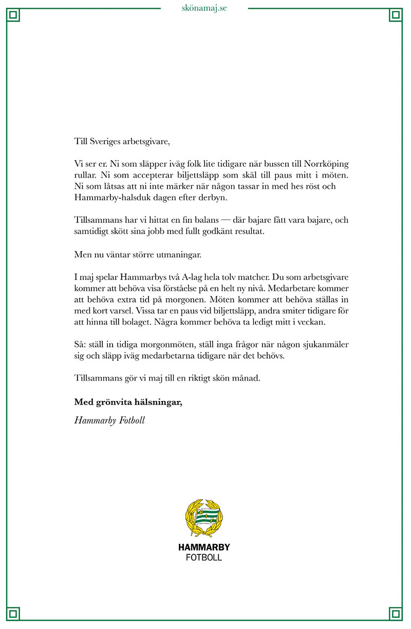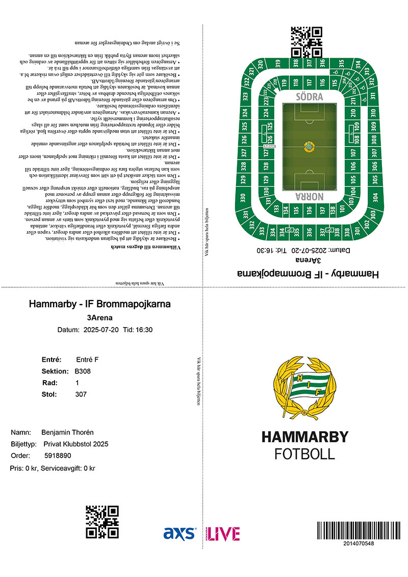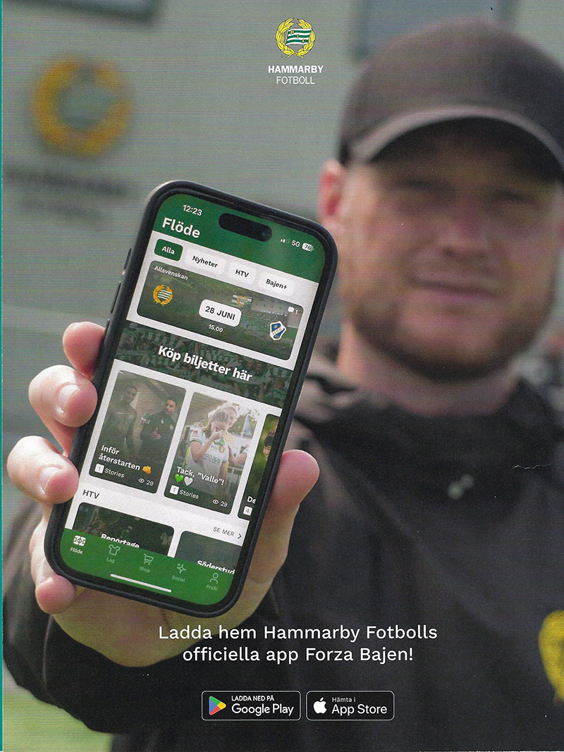 Markus Karlsson och Hampus Skoglund spelade i U21-landslaget. I P18 figurerade Elton Fischerström Opancar, Adrian Lahdo och Gustav Andrén. Emil Sadarangani, Kevin Andersson Lönnergård, Christian Burman, Björn Hedlöf, Milian Öberg, Emil Reyes Rigö och Matheo Elviersson Sica, Samuel Ramos representerade P17-landslaget under säsongen. Även P16/09-landslaget innehöll Hammarbyspelare: Svante Stangenberg, Hugo Hoffsten, Jakob Jensen, Benjamin Norell, Noah Ljungblom och Hugo Gyllenvall. I laget P16 Future Team spelade Benjamin Norell och Ludvig Lindberg. I det nya P15-landslaget figurerade Oliver Kusoffsky, Adreian Salvador och Felix Gertell Bjernvall. Allsvenskan250330 (Söderstadion/3Arena)Hammarby-IFK Göteborg 4-0 (2-0) 1-0 21 Markus Karlsson, 2-0 42 Jusef Erabi (Sebastian Tounekti), 3-0 73 Nahir Besara (Tesfaldet Tekie), 4-0 85 Simon Strand (Nahir Besara) Varningar, Hammarby: Shaquille Pinas Göteborg: August Erlingmark, Noah Tolf, Tobias Heintz Domare: Oscar Johnson/Marcus Klitte, Pär Leek, Tess Olofsson Publik: 30 217 250406 (Grimsta IP) Brommapojkarna-Hammarby 0-2 (0-0) 0-1 55 Shaquille Pinas (Sebastian Tounekti), 0-2 92 Nahir Besara (Tesfaldet Tekie) Varningar, BP: Ezekiel Alladoh, Oliver Zandén, Victor Stange Lind, Kevin Ackermann Hammarby: Victor Eriksson, Tesfaldet Tekie Domare: Glenn Nyberg/Mahbod Beigi, Andreas Söderkvist, Jasmin Svraka Publik: 4 254 250413 (Söderstadion/3Arena) Hammarby-Djurgården 2-0 (1-0) 1-0 41 Jusef Erabi (Paulos Abraham), 2-0 83 Abdelrahman Boudah (Jusef Erabi) Varningar, Hammarby: Markus Karlsson, Shaquille Pinas Djurgården: Zakaria Sawo, Daniel Stensson, Santeri Haarala, August Priske Flyger Domare: Kristoffer Karlsson/Mehmet Culum, Mikael Hallin, Adam Ladebäck Publik: 28 333 250418 (Strandvallen) Mjällby-Hammarby 3-1 (3-1) 1-0 7 Herman Johansson (Abdullah Iqbal), 1-1 17 Montader Madjed (Shaquille Pinas), 2-1 33 Nicklas Röjkjaer (Herman Johansson), 3-1 45+1 Ludwig Malachowski Thorell (Jacob Bergström) Varningar, Mjällby: Axel Norén, Abdullah Iqbal, Viktor Gustafson Domare: Fredrik Klitte/Pär Leek, Niclas Hummelgren, Adi Aganovic Publik: 5 941 250423 (Söderstadion/3Arena) Hammarby-Malmö 2-0 (0-0) 1-0 74 Sebastian Tounektie (Nahir Besara), 2-0 85 Markus Karlsson Varningar, Hammarby: Victor Eriksson, Tesfaldet Tekie Malmö: Lasse Berg Johnsen, Sead Haksabanovic Domare: Mohammed Al-Hakim/Mehmet Culum, Fredrik Klyver, Victor Wolf Publik: 27 884 250427 (Bravida Arena) Häcken-Hammarby 1-1 (0-0) 1-0 87 Silas Andersen (Samuel Leach Holm), 1-1 90 Elohim Kabore (Montader Madjed) Varningar, Häcken: Filip Öhman, Julius Lindberg, Rasmus Lindgren ass tränare Hammarby: Jusef Erabi Domare: Granit Maqedonci/Daniel Yng, Pär Leek, Fredrik Oppong Publik: 6 316 250504 (Visma Arena) Öster-Hammarby 0-3 (0-3) 0-1 23 Paulos Abraham (Victor Eriksson), 0-2 28 Nahir Besara (Hampus Skoglund), 0-3 43 Nahir Besara (Abdelrahman Boudah) Varningar, Öster: Noah Söderberg, Lukas Bergquist Domare: Richard Sundell/Daniel Gustavsson, Niclas Hummelgren, Rasmus Eriksson Publik: 11 435 250511 (Söderstadion/3Arena) Hammarby-Norrköping 1-1 (1-1) 0-1 15 Isak Andri Sigurgeirsson, 1-1 33 Montader Madjed Varningar, Hammarby: Tesfaldet Tekie, Shaquille Pinas, Abdelrahman Boudah Norrköping: Yahya Kalley, David Andersson Domare: Victor Wolf/Mikael Hallin, Per Rehnlund, Adam Ladebäck Publik: 27 431 250514 (Söderstadion/3Arena) Hammarby-Sirius 3-2 (1-1) 0-1 5 Noel Milleskog (Tobias Carlsson), 1-1 11 Victor Eriksson (Montader Madjed), 2-1 55 Nahir Besara, 2-2 68 Robbie Ure (Melker Heler), 3-2 71 Abdo Boudah (Jacob Ortmark) Varningar, Hammarby: Wilson Lindberg Uhrström Sirius: Saba Mamatsashvili, Robbie Ure Domare: Adi Aganovic/Simon Kristensson, Andreas Svensson, Richard Sundell Publik: 21 946 250518 (Strawberry Arena) AIK-Hammarby 0-0 Varningar, AIK: Bersant Celina, Dino Besirovic, Thomas Isherwood Hammarby: Pavle Vagic, Sebastian Tounekti, Abdelrahman Boudah Domare: Mohammed Al-Hakim/Mehmet Culum, Daniel Yng, Erik Mattsson Publik: 47 727 250522 (Söderstadion/3Arena) Hammarby-Mjällby 1-2 (1-1) 0-1 21 Ludwig Malachowski Thorell (Tom Pettersson), 1-1 43 Montader Madjed (Sebastian Tounekti), 1-2 65 Alexander Johansson (Herman Johansson) Varningar, Mjällby: Anders Torstentsson, tränare, Abdullah Iqbal, Viktor Gustafson Domare: Oscar Johnson/Andreas Svensson, Sebastian Robertsson, Victor Wolf Publik: 21 798 250526 (Söderstadion/3Arena) Hammarby-Degerfors 1-0 (0-0) 1-0 61 Nahir Besara (Tesfaldet Tekie) Varningar, Hammarby: Pavle Vagic, Sebastian Tounekti Domare: Mohammed Al-Hakim/Mehmet Culum, Robin Wilde, Jasmin Svraka Publik: 20 893 250531 (Borås Arena) Elfsborg-Hammarby 0-2 (0-0) 0-1 52 Simon Strand (Shaquille Pinas), 0-2 82 Abdelrahman Boudah (Markus Karlsson) Varningar, Elfsborg: Simon Olsson, Simon Hedlund, Per Frick Domare: Victor Wolf/Per Rehnlund, Pär Leek, Philip Lindh Publik: 14 239 250628 (Söderstadion/3Arena) Hammarby-Halmstad 2-0 (1-0) 1-0 30 Nahir Besara (Sebastian Tounekti), 2-0 59 Sebastian Tounekti (Victor Eriksson) Varningar, Hammarby: Shaquille Pinas Halmstad: Bleon Kurtulus, Joel Allansson Domare: Granit Maqedonci/Daniel Yng, Andreas Svensson, Jasmin Svraka Publik: 24 323 250705 (Söderstadion/3Arena) Hammarby-Värnamo 1-0 (0-0) 1-0 91 Elohim Kaboré (Abdelrahman Boudah) Varningar, Hammarby: Shaquille Pinas, Markus Karlsson, Elohim Kabore Värnamo: Luke Le Roux, Axel Björnström, Victor Larsson Utvisning, Värnamo: Rufai Mohammed (19) Domare: Fredrik Klitte/Simon Kristensson, Sebastian Robertsson, Farouk Nehdi Publik: 22 055 250713 (Gamla Ullevi) GAIS-Hammarby 3-2 (1-0) 1-0 30 Ibrahim Diabate, 1-1 52 Abulrahman Boudah (Sebastian Tounekti), 2-1 60 Ibrahim Diabate straff, 3-1 81 Amin Boudri (Ibrahim Yalatif), 3-2 85 Jusef Erabi straff Varningar, GAIS: Amin Boudri, Kevin Holmén Hammarby: Sebastian Tounekti Domare: Adam Ladebäck/Niklas Nyberg, Daniel Yng, Magnus Lindgren Publik: 16 789 250720 (Söderstadion/3Arena) Hammarby-Brommapojkarna 3-2 (0-2)