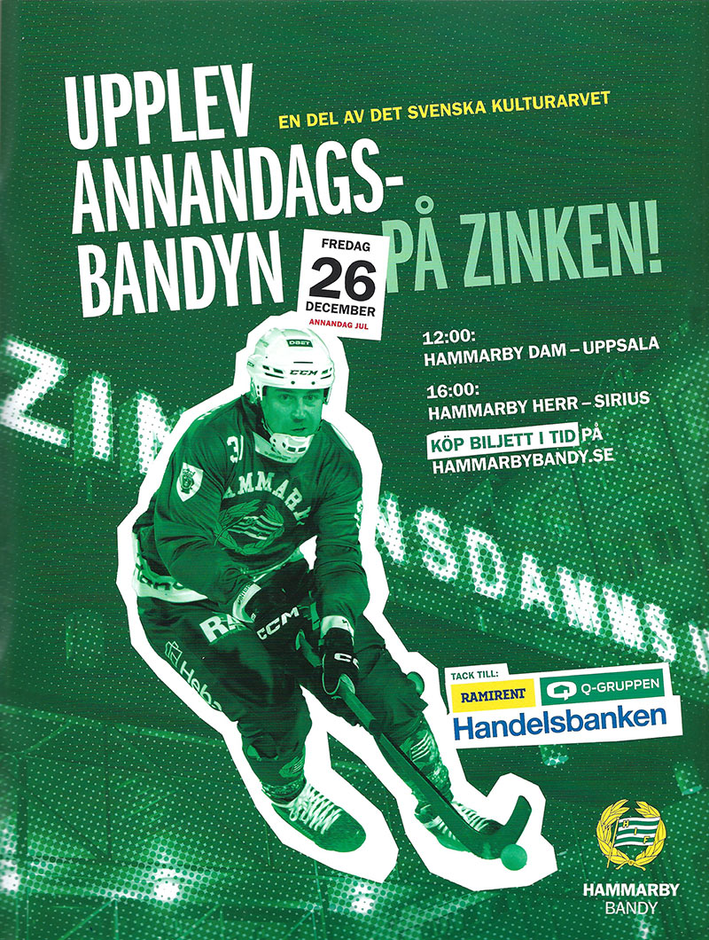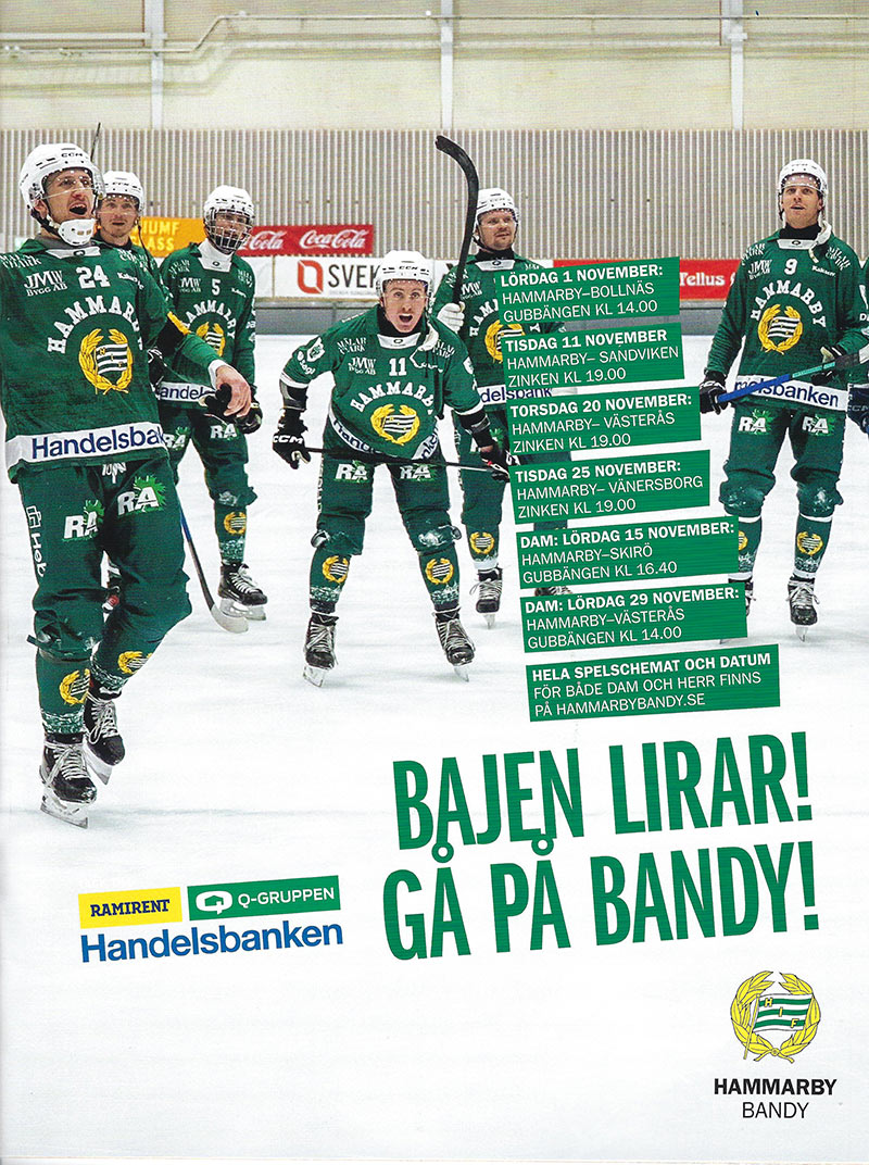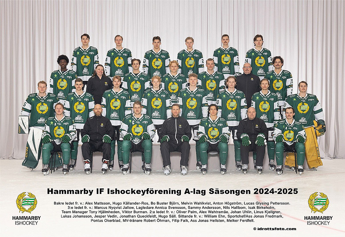 ArmbrytningVM (Azerbajdzjan, 251026)MasterSenior Grand Master 95 kg, vänster: 2. Benny Pettersson95 kg, höger: 3. Benny Pettersson EM (Estland, oktober 2025)MasterSenior Grand Master 95 kg, höger: 3. Benny PetterssonSMJuniorU21, 78 kg, vänster: 1. Felix Sirén, HammarbyU21, 78 kg, höger: 1. Felix Sirén, Hammarby U18, 78 kg, vänster: 3. Natan Kaleta, Hammarby MasterSenior Grand-Masters, 95 kg, vänster: 1. Benny Petterson, HammarbyBajen Armbash 250823Vänster:Herrar Pro -70 & -80: 2. Felix Sirén, Hammarby Pro -100/-90: 2. Valerijs Vacila, Hammarby Pro +100: 3. Vidar Gjermstad, Hammarby K2 -90, ihopslagen med -100: 1. William Forss, Hammarby K1 -70: 2. Giorgi Bitiashvili, Hammarby K1 -80: 1. Daniels Kuzmins, Hammarby 2. Natan Kaleta, Hammarby 3. Hugo Thuland, Hammarby K1 -100: 1. Jonas Djärv, Hammarby K2 -75: 1. Sara Hashemi, Hammarby Master Herr: 1. Johan Lindholm, Hammarby 2. Niklas Berg, Hammarby Junior killar -78: 1. Natan Kaleta, Hammarby Sub-Junior -: 3. Melvin Berg, Hammarby Andersson Höger: Herrar Pro -70 & -80: 1. Felix Sirén, Hammarby Pro -100: 1. Johan Lindholm, Hammarby K2 -80: 3. Oliver Westberg, Hammarby K2 -90, ihopslagen med -100: 2. William Forss, Hammarby K1 -70: 3. Giorgi Bitiashvili, Hammarby K1 -80: 1. Daniels Kuzmins, Hammarby K2 -75: 1. Sara Hashemi, Hammarby Junior killar -78: 3. Natan Kaleta, Hammarby Sub-Junior -: 1. Melvin Berg Bandy, herrarEfter sjätteplatsen i serien klappade man dit serietrean Vetlanda i tre raka. Sedan följde två suddenförluster i semifinalen mot Edsbyn, medan tredje matchen slutade med storsiffror. I P17-VM i Sandviken representerade två Hammarbyfostrade spelare: Martin Sellin och Liam Nyman. Det blev guld till Sverige. Elitserien241025 (Gubbängen)Hammarby-Villa Lidköping 3-6 (1-1) Hammarby: Fredrik Lönn, Lukas Forsström, Edwin Nilsson Villa: Christoffer Edlund 2, Martin Karlsson, William Arvidsson, Erik Säfström, Gustav Friman Domare: Jacob Liljegren/Andreas Lindvall Viktorsson, Christoffer Gille Publik: 611 241030 (Arena Vänersborg) Vänersborg-Hammarby 3-9 (0-5) Vänersborg: Juho Liukkonen, Mikko Lukkarila, Saku Hämäläinen Hammarby: Oskar Westh 3, David Jansson 2, Kasper Milerud, Ivan Lebedev, Tero Liimatainen, Albin Rohlén Domare: Niclas Schultz/Per Jakobsson, Johan Bengtsson Publik: 973 241101 (Gubbängen) Hammarby-Sandviken 6-3 (4-2) Hammarby: Oskar Westh 2, Kasper Milerud, David Jansson, Ivan Lebedev, Adam Gilljam Sandviken: Eric Hagberg, Joel Engström, Elliot Hellström Domare: Adam Jokinen/Gustaf Brunberg, Ludwig Hallkvist Publik: 582 241105 (SBB Arena) Bollnäs-Hammarby 8-4 (4-1) Bollnäs: Riku Hämäläinen 3, Danis Sadakov 2, Anton Dahlberg, Tatu Ässämäki, Erik Pettersson Hammarby: Oskar Westh, Olle Berglund, Tero Liimatainen Domare: Andreas Rönnbäck/Emil Larshans, Jonas Lindberg Publik: 1 544 241108 (Gubbängen) Hammarby-Frillesås 8-5 (5-2) Hammarby: David Jansson 4, Melker Broberg, Oskar Westh, Adam Gilljam, Albin Rohlén Sandviken: Adam Rudell 2, Linus Jönsson 2, Fredrik Johansson Domare: Andreas Broberg/Patrik Berglund, Oscar Haraldsson Publik: 443 241113 (Slättbergshallen) Gripen-Hammarby 2-3 (2-1) Gripen: Ilja Gratchev, August Klang Hammarby: Adam Gilljam, David Jansson, Tero Liimatainen Domare: Adam Jokinen/Erik Schultz, Gustaf Brunberg Publik: 753 241116 (Idrottsparken) Ljusdal-Hammarby 1-8 (0-4) Ljusdal: Kalle Mårtenson Hammarby: Tero Liimatainen 2, Kasper Milerud 2, David Jansson, Adam Gilljam, Albin Rohlén, Oskar Westh Domare: Niclas Schultz/Erik Schultz, Gustaf Brunberg Publik: 1 003 241120 (Zinkensdamm) Hammarby-Sirius 2-6 (0-2) Hammarby: Tero Liimatainen, Melker Broberg Sirius: Alexander Härndahl 3, Arvid Tapper 2, Ted Bergström Heramb Domare: Jonas Kandell/Calle Larshans, Oscar Haraldsson Publik: 964 241126 (Helsingehus Arena) Broberg-Hammarby 3-3 (2-0) Broberg: Martin Söderberg, Johannes Camilton, Daniel Jonsson Hammarby: Oskar Westh, David Jansson, Tero Liimatainen Domare: Gustav Bortas/Mattias Morberg, Jonas Lindberg Publik: 722 241129 (Zinkensdamm) Hammarby-Västerås 2-13 (2-8) Hammarby: David Jansson 2 Västerås: Christoffer Fagerström 3, Martin Flodström 3, Wilhelm Frimodig 2, Robin Andersson 2, Oscar Gröhn, Pontus Vilén, Martin Landström Domare: Anders Berg/Andreas Lindvall Viktorsson, Patrik Berglund Publik: 1 455 241204 (Zinkensdamm) Hammarby-Edsbyn 4-1 (1-0) Hammarby: Melker Broberg, David Jansson, Adam Gilljam, Tero Liimatainen Edsbyn: Albin Bysell Söderkvist Domare: Niclas Schultz/Christoffer Gille, Oscar Haraldsson Publik: 1 087 241207 (Eriksson Arena) Åby/Tjureda-Hammarby 4-8 (3-2) Åby: Viktor Hulthammar, Lucas Widman, Jonathan Svensson, Oskar Lundgren Hammarby: Melker Broberg 2, Tero Liimatainen 2, Kasper Milerud, David Jansson, Oskar Westh, Fredrik Lönn Domare: Niclas Schultz/Ludwig Hallkvist, Erik Schultz Publik: 402 241211 (Zinkensdamm) Hammarby-Vetlanda 3-4 (2-2) Hammarby: Adam Gilljam 2, Tero Liimatainen Vetlanda: August Ljung 2, Emil Fedorov 2 Domare: Anders Berg/Kenneth Kristiansson, Christoffer Gille Publik: 997 241214 (Svenska Fönster Arena) Edsbyn-Hammarby 6-3 (1-1) Edsbyn: Oscar Wikblad 3, Per Hellmyrs, Teemu Määttä, Samuli Helavuori Hammarby: Kasper Milerud, Oskar Westh, Caspher Ekström Domare: Jonas Kandell/Viktor Grahn, Calle Larshans Publik: 817 241217 (Zinkensdamm) Hammarby-Vänersborg 6-1 (3-1) Hammarby: David Jansson 3, Adam Gilljam, Oskar Westh, Kasper Milerud Vänersborg: Emil Viklund Domare: Niclas Schultz/Oscar Haraldsson, Patrik Berglund Publik: 928 241220 (Sjöaremossen) Frillesås-Hammarby 4-4 (2-2) Frillesås: Adam Rudell 2, Oskar Hulthammar, Linus Jönsson Hammarby: David Jansson 2, Kasper Milerud, Tero Liimatainen Domare: Gustav Bortas/Mattias Morberg, Jonas Lindberg Publik: 422 241226 (Studenternas) Sirius-Hammarby 2-4 (0-2) Sirius: Ted Bergström Heramb, Arvid Tapper Hammarby: David Jansson 2, Oskar Westh 2 Domare: Anders Berg/Johan Bengtsson, Per Jakobsson Publik: 4 531 241228 (Zinkensdamm) Hammarby-Bollnäs 3-7 (