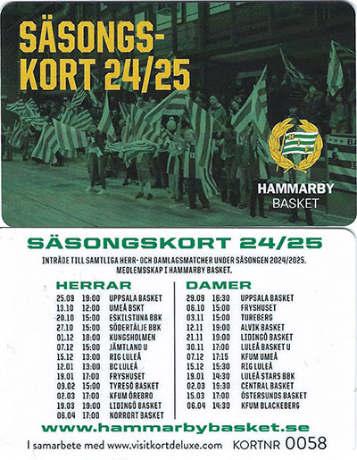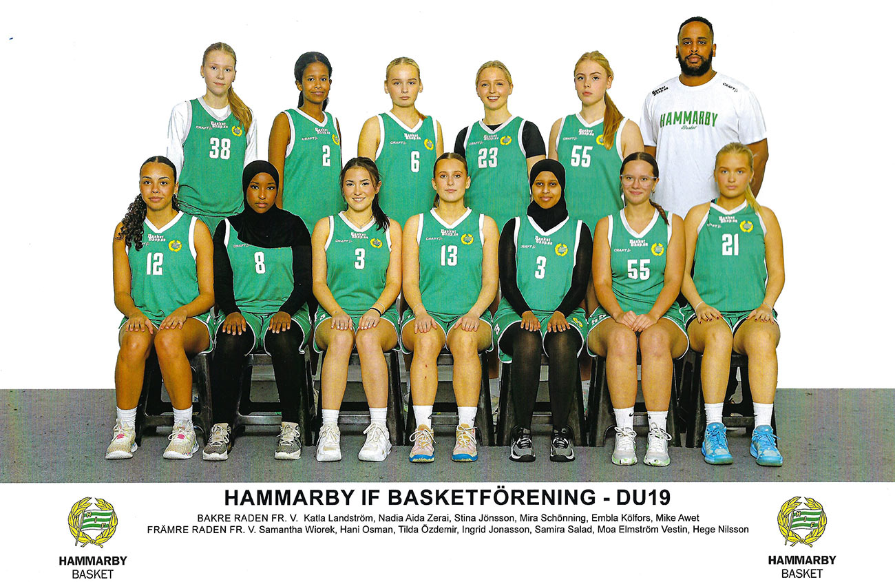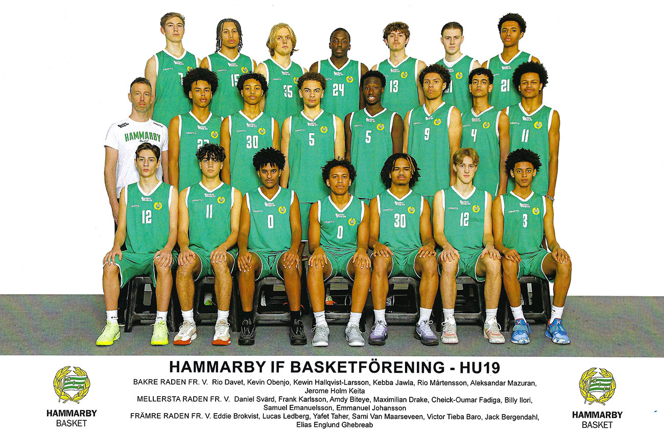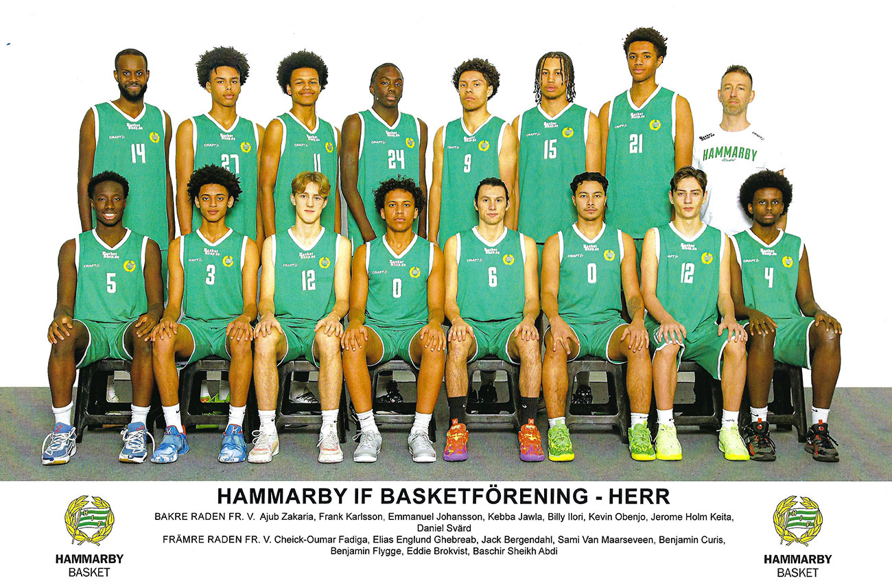 Bäst på herrsidan var 19-årslaget som tog en stark fjärdeplats i SM. På försäsongen fick två Hammarbyspelare representera landslaget i U16-EM Division B i Skopje, Nordmakedonien. Det var Rio Davet och Frank Karlsson som spelade i samtliga fem matcher där Sverige slutade åtta av 20 lag. Cheick-Oumar Fadiga spelade i det U18-landslag som deltog i Baltic Sea Basketball Cup i Tallinn, Estland i januari. Efter säsongen, i maj, arrangerades som vanligt Lampe Challenge. 160 lag från 51 olika föreningar i fyra länder var representerade, vilket är ett nytt rekord. Basketettan Norra240925 (Farstahallen)Hammarby-Uppsala 85-78 (21-21, 16-11, 17-31, 31-15) Hammarby: Eddie Brokvist 21, Cheick-Oumar Fadiga 15, Frank Karlsson 14, Linus Victorin 10, Kevin Obenjo 7, Kebba Jawla 7, Emmanuel Johansson 5, Jack Bergendahl 4, Winston Ilori 2 Uppsala: Samuel Eliasson 24, Robert Bolander 23, Fabian Illes 16, Victor Godberg 7, Robert Wirsén 4, Filip Milivojevic 4 Publik: 212 240928 (Idrottshuset) Örebro-Hammarby 78-120 (22-26, 12-38, 14-26, 30-30) Örebro: Stefan Dajic 17, Trevor Vasey 14, Wille Rosendahl 10, Musa Guled 10, August Göranzon 7, Melker Henriksson 5, James Lwal 5, Abubakar Mahad Abdi 4, Adam Mir 3, Benjamin Atic 2, Isak Öberg Hammarby: Cheik-Oumar Fadiga 25, Winston Ilori 18, Kevin Obenjo 17, Kebba Jawla 15, Linus Victorin 11, Frank Karlsson 10, Eddie Brokvist 10, Baschir Sheikh Abdi 10, Benjamin Flygge 2, Ajub Abdullahi Hassan 2 Publik: 200 241013 (Farstahallen) Hammarby-Umeå Basket 76-86 (24-21, 16-18, 23-24, 13-23) Hammarby: Kevin Obenjo 27, Linus Victorin 11, Kebba Jawla 8, Frank Karlsson 8, Benjamin Curis 7, Winston Ilori 7, Ajub Abdullah Hassan 4, Baschir Seikh Abdi 2, Eddie Brokvist 2 Umeå: Elias Andersson 26, Emil Häglund 24, Isak Andersson 8, Arvid Strömsten 8, Melvin Skogelid 6, Ludvig Munthe 4, Viktor Brännström Fisk 3, Oliver Holmström 3, Sokratis Pavlidis 2, Adam Rask 2 Publik: 142 241020 (Farstahallen) Hammarby-Eskilstuna 94-128 (22-31, 31-27, 29-36, 12-34) Hammarby: Baschir Sheikh Abdi 19, Kevin Obenjo 13, Frank Karlsson 12, Benjamin Curis 10, Winston Ilori 10, Kebba Jawla 10, Ajub Abdullahi Hassan 9, Benjamin Flygge 4, Sami Van Maarseveen 3, Jack Bergendahl 2, Emmanuel Johansson 2 Eskilstuna: Adam Karahmetovic 43, Simon Findén 33, Hampus Andersson 20, Einar Brådd 18, Elisha Ninkingira 9, Davids Eduards Alvateris 3, Alvar Brådd 2 Publik: 147 241027 (Farstahallen) Hammarby-Södertälje 92-93 (24-19, 22-25, 26-23, 20-26) Hammarby: Kevin Obenjo 22, Frank Karlsson 16, Ivan Resare 14, Cheik-Oumar Fadiga 12, Linus Victorin 8, Baschir Sheikh Abdi 6, Winston Iloroi 5, Benjamin Curis 5, Kebba Jawla 4 Södertälje: Aleksandar Cigoja 31, Theo Kermoury 24, David Skoog 17, Mac Omicevic 12, Viktor Schilström 4, Markus Njike Mbianda 3, Gustav Schilström 2 Publik: 148 241103 (Fryshuset CC) Fryshuset-Hammarby 86-85 (23-27, 22-24, 20-18, 21-16) Fryshuset: Zion Vaamonde 19, Rodrigas Jucevicius 17, Edwin Soamo 17, Micheal Odinks 13, Hannes Kodu 8, Victor Johnson Saka 6, Max Salazar 4, Ruben Öman 2 Hammarby: Benjamin Curis 14, Linus Victorin 14, Kevin Obenjo 10, Eddie Brokvist 9, Cheick-Oumar Fadiga 8, Kebba Jawla 7, Jerome Holm Keita 6, Winston Ilori 5, Ivan Resare 5, Baschir Sheikh Abdi 4, Benjamin Flygge 3 Publik: 85 241110 (Tibblehallen CC) Norrort-Hammarby 92-66 (26-10, 27-15, 15-25, 24-16) Norrort: Lucas Frejborg 17, Jonas Ehlde 11, Benjamin Poehler 11, Eric Fransson 9, Ruben Elbelin-Edlund 8, Oscar Westin 8, Tony Behnam 7, Aleksander Teigland 6, Dennis Musabasic 6, Robert Haegerstrand 5, Max Brygt 4 Hammarby: Kevin Obenjo 16, Cheick-Oumar Fadiga 13, Linus Victorin 11, Kebba Jawlo 6, Ivan Resare 6, Frank Karlsson 6, Winston Illori 4, Benjamin Curis 2, Eddie Brokvist 2 Publik: 83 241124 (Forellhallen) Tyresö-Hammarby 94-109 (19-26, 19-31, 29-25, 27-27) Tyresö: Hampus Åkerman 26, Leonard Cooks 24, Adam Hakla 18, Joys Tshibangu 14, Stefan Puric 4, Angelos Eleftheriadis 2, Linus Berglund 2, Liiban Abukar 2, Sihan Chen 2 Hammarby: Frank Karlsson 23, Kevin Obenjo 23, Linus Victorin 17, Ivan Resare 14, Cheick-Oumar Fadiga 14, Winston Ilori 5, Kebba Jawla 5, Eddie Brokvist 5, Jack Bergendahl 3 Publik: 100 241201 (Farstahallen) Hammarby-Kungsholmen 104-110 ot (26-18, 24-30, 18-24, 29-25, 7-13) Hammarby: Cheick-Oumar Fadiga 23, Frank Karlsson 22, Kevin Obenjo 21, Winston Ilori 19, Linus Victorin 11, Kebba Jawla 4, Jerome Holm Keita 2, Ivan Resare 2 Kungsholmen: Joakim Rosengren 43, Felix Wollberg 25, Isac Grytberg 16, Markus Pernyér 10, Samuel Pernyér 6, Johan Rosenbaum 5, Vilhelm Skygge 3, Viggo Fredriksson 2 Publik: 403 241207 (Farstahallen) Hammarby-Jämtland 108-97 (29-25, 30-28, 28-24, 21-20) Hammarby: Kevin Obenjo 25, Winston Ilori 16, Frank Karlsson 16, Linus Victorin 12, Benjamin Curis 12, Ivan Resare 11, Baschir Sheikh Abdi 6, Kebba Jawla 6, Sami Van Maarseveen 2, Jerome Holm Keita 2 Jämtland: Max Vall 26, Hannes Widell 16, Romeo Persson 15, Charlie Viklund 13, Abdella Hassan Nor 8, William Lundin 7, Otto Annerud 6, Moses Gihuri 4, David Gihuri 2 Publik: 118 241215 (Farstahallen) Hammarby-RIG Luleå 73-79 (22-15, 13-29, 16-14, 22-21) Hammarby: Baschir Sheikh Abdi 17, Emmanuel Johansson 17, Eddie Brokvist 13, Ivan Resare 9, E Englund Ghebreab 9, Benjamin Curis 6, Jack Bergendahl 2 RIG: Anton Fontin 18, Mass Jonsson Samateh 16, Alliou Fall 10, Marcus Le Cesne 9, Simon Ögren 9, Dante Jones 5, Harry Hassler 4, Tor Enevret 4, Samiel Lidberg 2, Wilmer Engstrand 2 Publik: 167 241221 (Hersby Sporthall) Lidingä-Hammarby 93-98 (25-15, 27-33, 17-21, 24-29) Lidingö: Tom Göransson 31, André Benediktsson 28, Jonathan Johansson 16, Anton Leth 8, August Key 4, Axel Pålsson 3, Viktor Aullo 2, Orgil Batkhuyag Hammarby: Cheick-Oumar Fadiga 34, Frank Karlsson 27, Ivan Resare 13, Kevin Obenjo 12, Winston Ilori 4, Kebba Jawla 4, Linus Victorin 2, Jerome Holm Keita 2 Publik: 53 250112 (Farstahallen) Hammarby-BC Luleå Steelers 115-86 (34-14, 31-23, 30-21, 20-28) Hammarby: Cheik-Ou
