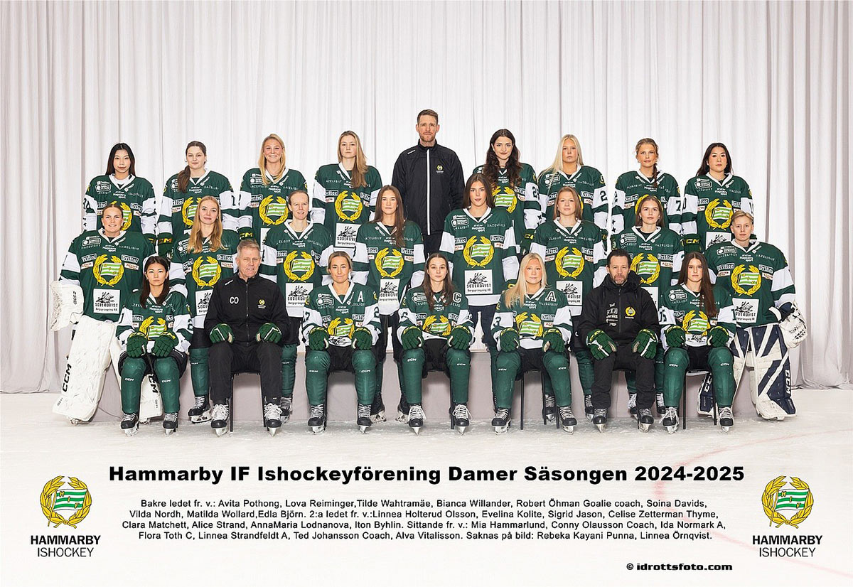 Hammarbys Tova Anderhag Braconier var med i det F17-landslag som vann VM-guld i Trollhättan i februari. Elitserien241027 (Gubbängen)Hammarby-Uppsala 3-4 (2-1) Hammarby: Diana Lipanova, Malin Ekström, Karina Lipanova Uppsala: Sofia Ihrén 2, Sofia Eriksson, Stella Wallin Domare: Linn Wickerhoff/Kenneth Kristiansson, Linus Rydell Publik: 84 241102 (Arena Vänersborg) Vänersborg-Hammarby 2-9 (1-3) Vänersborg: Klara Ahlstedt 2 Hammarby: Diana Lipanova 6, Malin Ekström, Sophia Wikström, Tanja Illarionova Domare: Andreas Dahlsten/Viktor Fritzon, Mattias Öhrn Publik: 87 241109 (Gubbängen) Hammarby-Västerås 3-5 (3-3) Hammarby: Karina Lipanova 2, Tanja Illarionova Västerås: Edit Ljung 3, Hilda Kolsmyr, Charlotte Selbekk Domare: Daniel Carlfjord/Björn Spångmark, Patrik Widmark Publik: 75 241116 (Hydro Arena) Skirö-Hammarby 10-5 (4-3) Skirö: Klara Sandberg 2, Emma Drott 2, Ella Oskarsson 2, Klara Volmerson, Tilde Elmersson, Emma Nilsson, Gabriella Aronsson Hammarby: Tanja Illarionova 3, Olga Rodionova, Karina Lipanova Domare: Håkan Grunditz/Andreas Pettersson, Axel Davidsson Publik: 120 241123 (Gubbängen) Hammarby-Villa 2-13 (1-8) Hammarby: Diana Lipanova, Malin Ekström Villa: Agnes Ögren 3, Märta Stern 2, Ida Friman 2, Melinda Altberg, Ellen Nilsson, Frida Wiklund, Ebba Stern, Moa Friman, Marie Dregler Nordbo Domare: David Järvinen/Ludwig Hallkvist, Erik Schultz Publik: 57 241130 (Gubbängen) Hammarby-Mölndal 3-1 (2-0) Hammarby: Olga Rodionova 2, Tova Anderhag Braconier Mölndal: Tilda Andersson Domare: Daniel Carlfjord/Björn Spångmark, Oscar Haraldsson Publik: 45 241214 (Göransson Arena) Sandviken-Hammarby 7-0 (5-0) Tilda Ström 4, Emma Ahlander 2, Hanna Spjut Domare: Linn Wickerhoff/Oscar Haraldsson, Alfred Spångmark 241221 (Zinkensdamm) Hammarby-Sandviken 0-9 (0-1) Tilda Ström 5, Moa Rantala, Wilma Linderqvist, Emma Ahlander, Emelie Åkerlund Domare: Adam Jokinen/Gunnar Sonnerby, Kenneth Kristiansson Publik: 95 241226 (Studenternas) Uppsala-Hammarby 8-1 (5-1) Uppsala: Sofia Ihrén 2, Stella Wallin 2, Sara Bahamondez, Hanna Snäll, Josefin Jarstad, WIlma Thörnkvist Hammarby: Lina Lempinen Domare: Daniel Carlfjord/Linus Rydell, Björn Spångmark Publik: 175 250104 (Zinkensdamm) Hammarby-Skirö 3-7 (1-3) Hammarby: Olga Rodionova 2, Diana Lipanova Skirö: Ella Oskarsson 4, Klara Sandberg, Astrid Widlert, Emma Drott Domare: Gustav Bortas/Samuel Karlsson, Jonatan Vejby Publik: 125 250111 (ABB Arena Syd) Västerås-Hammarby 12-1 (5-1) Västerås: Charlotte Selbekk 6, Edit Ljung 2, Julia Norrman, Erica Persson, Kajsa Ericsson, Toba Grönoset Hammarby: Olga Rodionova Domare: Jonas Kandell/Nicklas Sikström, Malte Svedberg Publik: 149 250118 (Åby Isstadion) Mölndal-Hammarby 5-5 (3-3) Mölndal: Wilda Ejderfalk 3, Caroline Pettersson, Stephannie Lundqvist Hammarby: Olga Rodionova 3, Tanja Illarionova, Hanna Hansson Domare: Håkan Grunditz/Örjan Bruce, Robert Jonsson Publik: 120 250201 (Zinkensdamm) Hammarby-Vänersborg 7-3 (4-2) Hammarby: Lina Lempinen 3, Olga Rodionova, Sophia Wikström, Sofie Zachrisson, Diana Lipanova Vänersborg: Filippa Bogfors, Klara Ahlstedt, Wilma Larsson Domare: Ted Esplund/Hannah Pettersson, Julia Thompson Publik: 128 250208 (Sparbanken Lidköping Arena) Villa Lidköping-Hammarby 11-5 (5-3) Villa: Freja Lööf 3, Melina Altberg 2, Ellen Nilsson 2, Moa Friman 2, Agnes Ögren, Marie Dregler Nordbo Hammarby: Diana Lipanova 2, Lina Lempinen, Tanja Illarionova, Olga Rodionova Domare: Tomas Ljung/Alexander Silvesjö, Joakim Karlsson Publik: 281 Slutspel250215 (Kronfågel Isarena, Katrineholm)Västerås SK-Hammarby 15-1 (9-0) Västerås: Edit Ljung 4, Linda Lohiniva 3, Charlotte Selbekk 3, Galina Mikhaylova 2, Karla Thuresson, Kajsa Ericsson, Tova Grönoset Hammarby: Tanja Illarionova Domare: Linn Wickerhoff/Linus Rydell, Ludwig Hallkvist Publik: 118 250219 (Zinkensdamm) Hammarby-Västerås SK 2-8 (1-3) Hammarby: Diana Lipanova, Tanja Illarionova Västerås: Edit Ljung 3, Linda Lohiniva 2, Charlotte Selbekk, Karla Thuresson, Isabelle Hedberg Domare: Jörgen Wingstedt/Björk Spångmark, Johan Hedell Publik: 138 Svenska cupen240914 (Gruppspel, Åby Isstadion)Mölndal BK-Hammarby 2-4 (1-2) Mölndal: Erica Johnsson, Wilda Ejderfalk Hammarby: Karina Lipanova 2, Emma Andersson och Olga Rodionova Domare: Michael Rosvall/Marcus Hector, Max Rosvall Publik: 72 240926 (Sparbanken Lidköping Arena) Villa Lidköping-Hammarby 16-2 (5-2) Villa: Lua Nyberg 3, Moa Friman 3, Marie Dregler Nordbo 3, Freja Lööf 2, Sanna Gustafsson, Agnes Ögren, Annie Bemer, Ellen Nilsson, Ebba Stern Hammarby: Karina Lipanova, Tanja Illarionva Domare: Linn Wickerhoff/Hanna Pettersson, Max Rosvall Publik: 222 240928 (Söderstadion/Tele2 Arena) Hammarby-Skirö AIK 3-6 (3-3) Hammarby: Inez Edenberg, Sophia Wikström, Diana Lipanova Skirö: Gabriella Aronsson 2, Ella Oskarsson 2, Emma Drott, Emma Nilsson Domare: Linn Wickerhoff/Patrik Widmark, Håkan Andersen Publik: 65 Spelartruppen7. Emma Andersson, 23 år9. Josefin Arvidsson, 23 år 10. Ingrik Helen Bjonge, 30 år 26. Tova Anderhag Braconier, 16 år 8. Emma Dalin, 20 år 22. Ida Edenberg, 18 år 15. Inez Edenberg, 20 år 11. Malin Ekström, 18 år 18. Hanna Hansson, 27 år 14. Tanja Illarionova, 21 år 50. Lina Lempinen, 22 år 5. Tytti Lempinen, 19 år 77. Moa Liljendahl, 23 år 66. Diana Lipanova, 32 år 90. Karina Lipanova, 29 år 21. Almira Podkorytova, 31 år 17. Olga Rodionova, 39 år 55. Jacqueline Sporre, 19 år 1. Maria Thorén, 37 år 19. Sophia Wikström, 20 år 20. Sofie Zachrisson, 32 år Tränare: Bengt-Olof Andersson Stefan Stanzé Hjälptränare: Filip Karlsson Sebastian Roswall Målvaktstränare: Mats Irstam Lagledare: Magnus Alfredsson Bandyallsvenskan Dam Södra241117 Hammarby-Mölndal 3-5241124 Skirö-Hammarby 8-3 241206 Västerås-Hammarby 18-1 241208 Hammarby-Villa-Lidköping 4-6 241214 Gripen/Höjden-Hammarby 2-5 241215 Surte-Hammarby 7-1 241222 Sunvära-Hammarby 6-1 241229 Hammarby-Gripen/Höjden 9-0 250105 Hammarby
