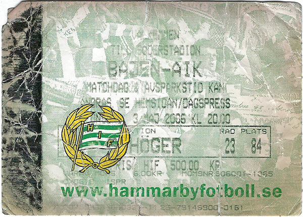 Så sent som i omgång 14 ledde Bajen Allsvenskan en poäng före AIK. Men ett par förluster följt av den beryktade hemmamatchen mot Djurgården avgjorde Hammarbys öde denna säsong. Djurgården straffade ett svagt spelade Hammarby och ledde med 3-0 då domare Martin Ingvarsson valde att bryta matchen på grund av läktaroroligheter. Att gå så långt som tidningen Aftonbladet gjorde när man proklamerade fotbollens död, var att dra alltför långa växlar på det som inträffade. Betydligt värre läktarkravaller har skett otaliga gånger inom svensk fotboll, både före och efter. Dock utan att ena laget blev av med tre poäng som Hammarby drabbades av. Det har sagts att det var supportrarna som spelade bort guldet för Hammarby detta år. Det kan mycket väl stämma även om man måste räkna in Björn Runströms flytt under säsongen samt efterhängsna skador på Mikkel Jensen och Petter Andersson. Att oroligheterna bidrog till en tristare stämning, med publik- och sponsortapp torde dock vara ganska klart. Hösten var inte bara mungiporna nedåt. David Johansson slog igenom som försvarare, och man gjorde två riktiga klipp i Sebastián Eguren och Louay Chanko. Paulinhos 12 strutar räckte till en andraplats i den allsvenska skytteligan Klubbens satsning på Talanglaget betalade sig med uppflyttningen av försvararen José Monteiro. Dessutom gjorde Sebastian Castro-Tello sina första framträdanden i A-laget. Den goda återväxten visade sig inte minst i pojklagets SM-guld efter seger över Elfsborg i finalen. Även juniorlaget tillhörde de tio bästa i Sverige även om man åkte ur tidigit i JSM. Två Hammarbyspelare fick göra två a-landslagsmatcher var. Det var Max von Schlebrügge och Jeffrey Aubynn. Alexander Östlund (då i Southampton) fick spela en match innan han försvann ut i kylan. Kennedy Bakircioglü (Twente) lirade i två matcher och Rami Shaaban (Fredriksstad) var med åtta gånger. I U21-landslaget fanns fler Bajenlirare; Petter Andersson, Isak Dahlin, Björn Runström, Fredrik Stoor och Erkan Zengin. Dessutom Andreas Dahl (då i Helsingborg). Även de yngre landslagen hade Hammarbyinslag. Sebastian Castro-Tello och Isak Dahlin spelade i J19, Tobias Holmqvist (då i Helsingborg) spelade i J18, George Moussan och Linus Hallenius (då i Sundsvall) gjorde matcher i J-P17. I P16 härjade Eskilstunas Simon Helg och BP:s Marcus Törnstrand. Det fanns en del svenska utlandsproffs som spelat i eller var på väg till Hammarby. I England fanns Patrik Gerrbrand i Leicester City (senare i norska Fredriksstad) och Alexander Östlund i Southampton FC (kom från Feyenoord under säsongen). I Grekland spelade Louay Chanko (AEK Aten) och i Holland fanns Kennedy Bakircioglü (FC Twente). Gerrbrands flytt till Norge innebar att han blev klubbkamrat med Rami Shaaban. Mikael Andersson spelade i Sandefjord. Fredrik Söderström spelade i Córdoba CF i spanska Segunda División B. Allsvenskan060404 (Söderstadion)Hammarby-Helsingborg 4-2 (3-0) Lagbild Biljett 1-0 20 Paulinho Guará (Petter Furuseth Olsen), 2-0 32 Paulinho Guára, 3-0 35 Björn Runström, 3-1 68 Gustaf Andersson, 4-1 84 Max von Schlebrügge, 4-2 89 McDonald Mariga Varningar, Hammarby: Björn Runström Helsingborg: McDonald Mariga, Babis Stefanidis, Olivier Karekezi Domare: Martin Hansson, Holmsjö/Joakim Flink, Karlskrona, Mirce Popovski, Göteborg, Johan Hamlin, Enköping Publik: 12 119 060410 (Fotbollsstadion) Djurgården-Hammarby 0-0 Program Varningar, Hammarby: Mikkel Jensen, Petter Furuseth Olsen Utv, Djurgården: Mattias Jonson (54) Domare: Jonas Eriksson/Stefan Wittberg, Peter Ekström, Stefan Johannesson Publik: 30 139 060417 (Malmö Stadion) Malmö-Hammarby 1-2 (0-1) 0-1 74 självmål Raoul Kouakou, 0-2 62 Paulinho Guará, 1-2 72 Edward Ofere Varning, Malmö: Afonso Alves Domare: Peter Fröjdfeldt, Eskilstuna Publik: 18 665 060423 (Söderstadion) Hammarby-Halmstad 0-0 Lagbild Annons Varningar, Hammarby: Petter Andersson, Björn Runström Halmstad: Emil Jensen Utv, Hammarby: Mikkel Jensen (79, två gula) Domare: Daniel Stålhammar, Landskrona/Kenneth Petersson, Norrköping, Peter Martinsson, Bunkeflostrand, Jonny Ahlvin, Tyresö Publik: 12 333 060427 (Gamla Ullevi) Göteborg-Hammarby 1-2 (0-1) 0-1 8 Björn Runström (Jeffrey Aubynn), 0-2 69 Björn Runström (Jeffrey Aubynn), 1-2 78 Karl Svensson Utvisningar, Göteborg: Magnus Johansson (71) Hammarby: Max von Schlebrügge (62, två gula) Domare: Håkan Jonasson Publik: 8 341 060503 (Söderstadion) Hammarby-AIK 2-0 (1-0) Program Tifo Tifo Biljett 1-0 32 Mikkel Jensen (Jeffrey Aubynn), 2-0 89 Paulinho Guará (Petter Furuseth Olsen) Varningar, Hammarby: Gunnar Thor Gunnarsson, Petter Andersson AIK: Nicklas Carlsson, Kenny Pavey Domare: Peter Fröjdfeldt, Eskilstuna/Ingemar Larsson, Bromma, Mathias Klasenius, Örebro, Patrik Malmberg, Uppsala Publik: 14 694 060507 (Fredriksskans) Kalmar-Hammarby 4-1 (2-1) 0-1 7 självmål Niklas Kaldner, 1-1 13 Viktor Elm, 2-1 14 Mikael Blomberg, 3-1 59 Lasse Johansson, 4-1 71 Mikael Blomberg straff Varningar, Kalmar: Ari da Silva Ferreira Hammarby: Pétur Marteinsson Utv, Kalmar: Cesar Santín (84) Hammarby: Suleyman Sleyman (72, två gula) Domare: Åke Andreasson Publik: 6 641 060510 (Söderstadion) Hammarby-GAIS 5-2 (3-1) Lagbild 1-0 26 Petter Furuseth Olsen (Jeffrey Aubynn), 1-1 30 Daniel Nicklasson, 2-1 30 Paulinho Guará (Petter Furuseth Olsen), 3-1 45 Petter Andersson (Jeffrey Aubynn), 4-1 51 Paulinho Guará (Jeffrey Aubynn), 5-1 54 Björn Runström, 5-2 60 Martin Dohlsten Varningar, Hammarby: Erkan Zengin GAIS: Daniel Blomgren, Daniel Nicklasson Domare: Martin Ingvarsson, Hässleholm/Kenneth Petersson, Norrköping, Henrik Andrén, Karlstad, Johan Fält, Solna Publik: 12 458 060514 (Strömvallen) Gefle-Hammarby 0-1 (0-1) Program 0-1 39 Paulinho Guará (Mikkel Jensen) Varningar, Gefle: René Makondele Hammarby: Max von Schlebrügge, Mikkel Jensen Domare: Miro Ukalovic, Hisings Kärra Publik: 7 090 060717 (Söderstadion) Ha