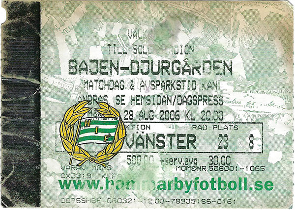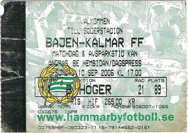 Falköping, breddHammarby-Brukarhusets IF 14-4Ängarna-Hammarby 3-4 Hammarby-FIFH Malmö 1-3 Sugi-Hammarby 0-6 Hammarby-IFAS Power 8-4 Handboll, herrar2006 inleddes tre fantastiska guldår för handbollen. Och i det första guldlaget, som besegrade Sävehof med 34-31 i finalen, ingick Michael Jansson, Jan Ekman, Lukas Karlsson, Tobias Karlsson, Svend Magnus Pettersen, Johan Henricsson, Michael Apelgren, Nicklas Grundsten, Daniel Båverud, Texas Olsson, Fredrik Larsson, Joel Rasmusson, Lars Arvidson, Espen Nygård och Olle Johannesson. Johan Henricsson, Michael Apelgren och Olle Johannesson representerade U21-landslaget under säsongen. Lukas Karlsson spelade i A-landslaget. Även Tobias Karlsson och Thomas Forsberg figurerade på A-landslagsläger. Till juniorlandslagets träningsläger efter säsongen uttogs Petter Holmberg, Texas Olsson, Stefan Petrovic, Daniel Karlsson och Kalle Ström. I november uppdagades det vid en rutinoperation att 21-årige Olle Johannesson drabbats av testikelcancer. I matchen därpå kom samtliga Hammarbyspelare till match med rakade huvuden. Motiveringen löd: ”När Olle kommer ner på träningarna i fortsättningen ska han inte behöva se fulare ut än oss”. Johannesson besegrade sjukdomen och kom tillbaka till spel. I samma veva hade föreningen Kronofogden i hasorna. En insamling med namnet "Stoppa fogden!" genererade 279 835 kronor vilket avvärjde faran. Elitserien050921 (Nolhagahallen)Alingsås-Hammarby 22-29 (15-9) Alingsås: Johan Andreasson 5, Gustav Hallbert 5, Teddy Nordling 4 (1), Jesper Höglund 3, Robert Goude 2 (2), Oskar Sandström, Sebastian Stenbäcken och Carl-Johan Lång Hammarby: Johan Henricsson 7 (5), Lukas Karlsson 6, Michael Apelgren 4, Nicklas Grundsten 4, Olle Johannesson 3, Tobias Karlsson 2, Daniel Båverud, Lars Arvidsson, Espen Nygård Utvisningar Alingsås: 6x2 min (1 rött kort) Hammarby: 4x2 min Publik: 1 041 050925 (Eriksdalshallen) Hammarby-Heim/Mölndal 32-29 (15-12) Matchaffisch Flygblad Hammarby: Michael Apelgren 7, Nicklas Grundsten 6, Tobias Karlsson 4, Svend Magnus Pettersen 4, Espen Nygård 4, Johan Henricsson 3 (3), Lukas Karlsson 2, Daniel Båverud 2 Heim: Petter Bågenholm 11 (4), Tomas Bredenfeldt 5, Robert Brunström 2, Björn Iveland 2, Henrik Ekelund 2, Nano Garrido 2, Anders Rylander 2, Marcus Olausson 2, Jerry Crona Utvisningar: Hammarby 2x2 min, Heim 5x2 min Domare: Per-Ola Björk, Trelleborg, Krister Andersson, Malmö Publik: 1 087 050928 (Österportshallen) Ystad-Hammarby 33-37 (15-18) Ystad: Marko Tanaskovic 8, Fredrik Petersen 7 (1), Sergo Datukashvili 6, Payam Hatami 4, Oskar Erixon 3, Henrik Knudsen 3, Linus Rasmussen 2 (2) Hammarby: Nicklas Grundsten 9, Fredrik Larsson 7, Espen Nygård 5, Lukas Karlsson 4, Johan Henricsson 4 (4), Tobias Karlsson 2, Svend Magnus Pettersen, Michael Apelgren, Daniel Båverud, Lasse Arvidsson, Olle Johannesson, Jan Ekman Utvisningar: Ystad: 3x2 min, Hammarby: 2x2 min 051006 (Eriksdalshallen) Hammarby-H 43 40-29 (18-11) Matchaffisch Program Hammarby: Nicklas Grundsten 10, Lukas Karlsson 5, Johan Henricsson 4 (2), Michael Apelgren 4 (2), Espen Nygård 4, Svend Magnus Pettersen 4, Daniel Båverud 3, Petter Holmberg 3, Tobias Karlsson, Fredrik Larsson, Olle Johannesson H43: Zoran Roganovic 8 (3), Olof Ask 6, Nemanja Milosevic 3, Johan Green 3, Niklas Ganneby 2 (1), Calle Tagesson 2, Martin Mårtensson 2, Alexander Simic 2, Fredrik Jonsson Utvisningar: Hammarby 4x2 min, H43 8x2 min Domare: Mikael Claesson, Rickard Canbro Publik: 1 153 051012 (Eriksdalshallen) Hammarby-Skövde 36-29 (18-15) Program Hammarby: Nicklas Grundsten 11, Espen Nygård 8, Tobias Karlsson 4, Fredrik Larsson 4, Lukas Karlsson 3, Olle Johannesson 3, Svend Magnus Pettersen, Michael Apelgren, Petter Holmberg Skövde: Vegard Samdahl 7, Magnus Järlström 5, Rasmus Wremer 4 (1), Mattias Gustafsson 4, Marcus Wallgren 3, Marcus Litborn 3, Jasmin Jahic 2, Mattias Söder Utvisningar: Hammarby 2x2 min, Skövde 4x2 min Domare: Anders Wiiand, Hallsberg, Jan Rutström, Örebro Publik: 823 051019 (Partillebohallen) Sävehof-Hammarby 33-26 (17-12) Sävehof: Jonas Larholm 11 (5), Erik Fritzon 7, Spyros Balomenas 5, Tommy Atterhäll 3, Patrik Fahlgren 2, Jonas Ernelind 2, Jan Lennartsson 2, Tomas Gustafsson Hammarby: Michael Apelgren 6 (4), Johan Henricsson 3, Daniel Båverud 3, Fredrik Larsson 3, Espen Nygård 3, Lukas Karlsson 2, Tobias Karlsson 2, Nicklas Grundsten 2, Petter Holmberg 2 Utvisningar: Sävehof 4x2 min, Hammarby 4x2 min Domare: Stefan Silfverberg, Hjärup, Jonas Johnsson, Lund Publik: 1 505 051022 (Eriksdalshallen) Hammarby-Guif 29-32 (8-16) Program Hammarby: Tobias Karlsson 10, Fredrik Larsson 5, Nicklas Grundsten 4, Lukas Karlsson 3 (1), Johan Henricsson 3, Michael Apelgren 3, Olle Johannesson Guif: Aleksandar Svitlica 7, Johan Lindberg 7 (1), Niklas Johansson 5, Peter Luksic 5, Mikael Johansson 3 (1), Patrik Johansson 2, Jimmy Jansson, David Isomäki, Martin Nilsson Utvisningar: Hammarby 2x2 min 1 Rött kort, Guif 6x2 min 1 Rött kort Domare: Magnus Johansson, Enköping, Nicklas Ståhl, Motala Publik: 1 523 051109 Lindesberg-Hammarby 34-37 (14-23) Lindesberg: Tobias Warvne 9, Herman Arenvang 7, Erik Axelsson 7, Richard Eriksson 6, Niklas Bååk 4, Simon Anfält Hammarby: Michael Apelgren 8, Lukas Karlsson 7, Fredrik Larsson 6, Svend Magnus Pettersen 5, Nicklas Grundsten 4, Daniel Båverud 2, Espen Nygård 2, Lars Arvidson, Johan Henricsson, Petter Holmberg Publik: 2 100 051115 (Eriksdalshallen) Hammarby-Redbergslid 31-24 (19-14) Program Hammarby: Michael Apelgren 8 (3), Tobias Karlsson 6, Lukas Karlsson 4, Nicklas Grundsten 4, Joel Rasmuson 4, Daniel Båverud 2, Petter Holmberg, Lasse Arvidsson, Espen Nygård Redbergslid: Fredrik Lindahl 5, Lars Bernhardsson 5, Staffan Henriksson 4, Joacim Ernstsson 3 (2), Tommy Petterson 3, Fredrik Petterson 1 (1), Marcus Svensson, Alexander Borgstedt, Joakim Bäckström Utvisningar: Hammarby 5x2 min, Redbergslid 6x2 min Domare: Jonas Johnsson, Lund, Stefan Silfv